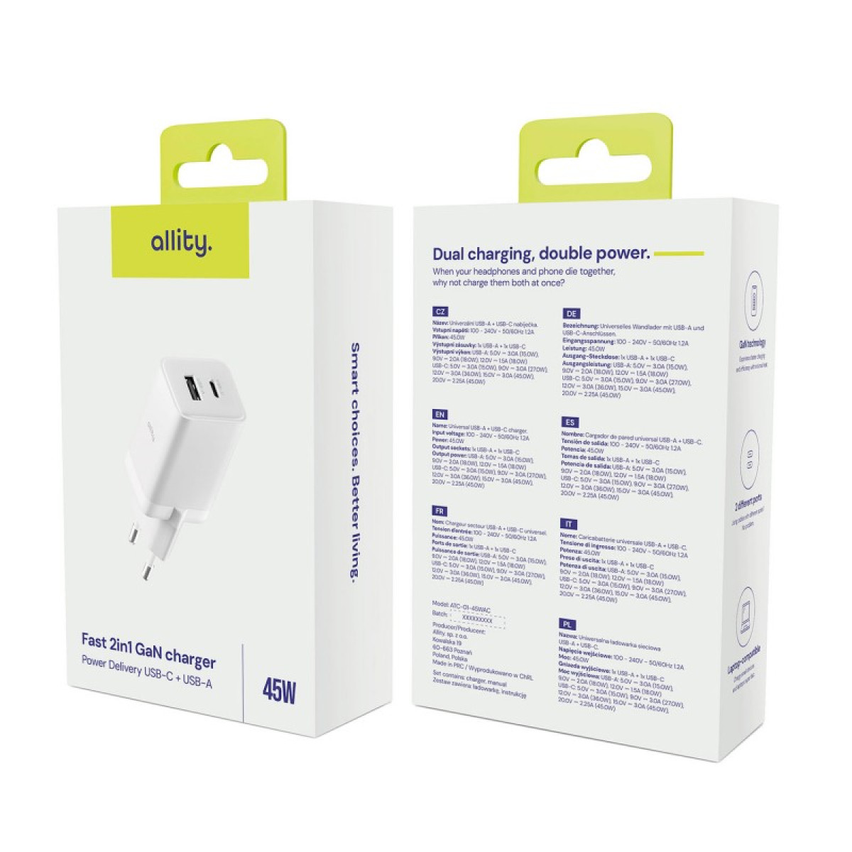 "Allity" sieninis įkroviklis GaN PD QC ATC-01-45WAC 1x USB-C 1x USB-A 45W baltas