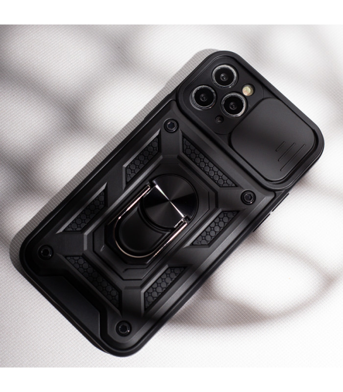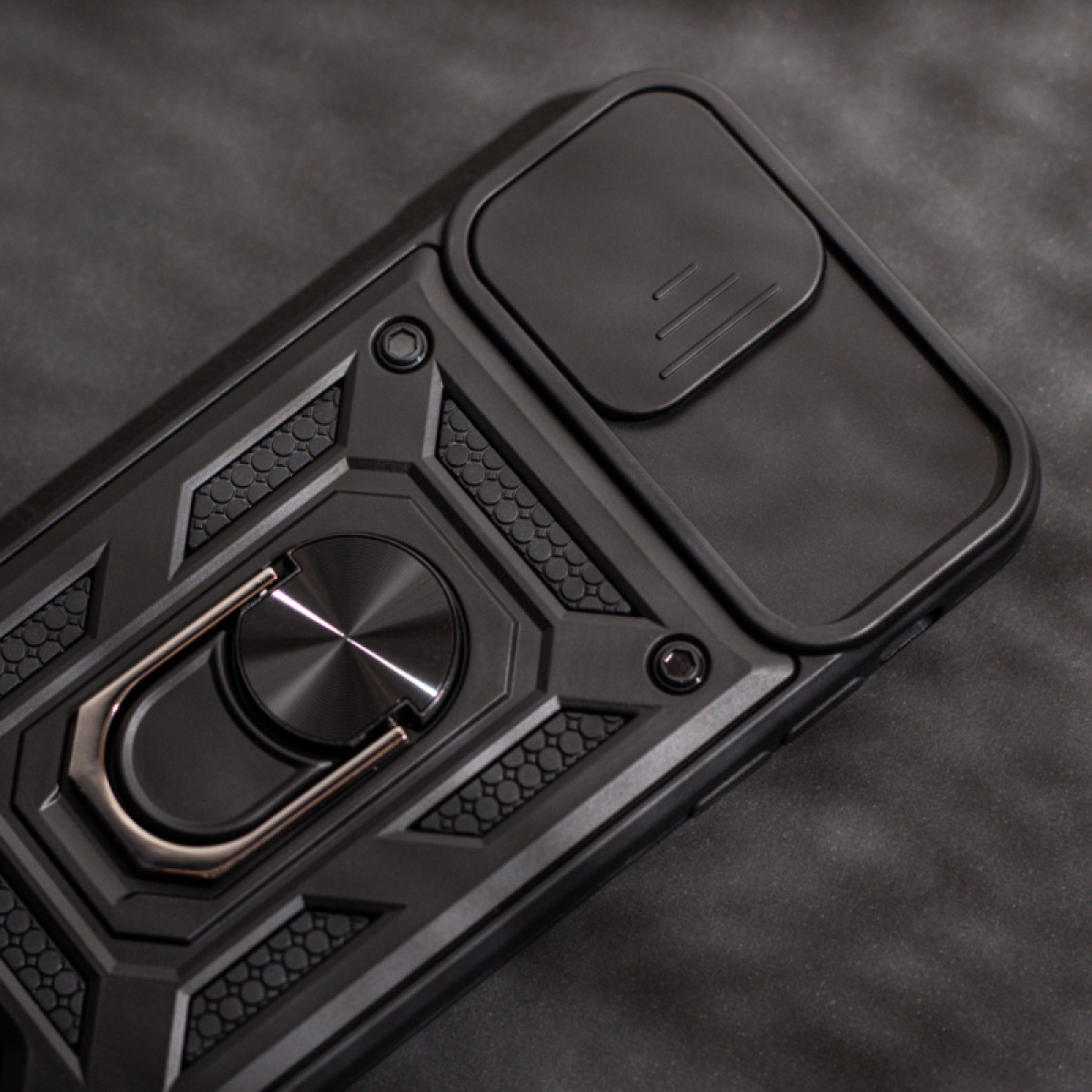 Defender Slide is a reinforced smartphone case that provides good protection for the device. The product consists of several layers that stiffen and strengthen its structure. The case is made of PC, TPU, and features a built-in aluminum finger holder. The entire series has a movable camera cover that protects the lenses and ensures privacy. Additionally, the higher edges protect the screen from cracking or scratching. The cases have necessary cutouts for ports and embossing for buttons. The frame has openings that allow for attaching a strap or lanyard. The Defender Slide case is compatible with magnetic mounts.