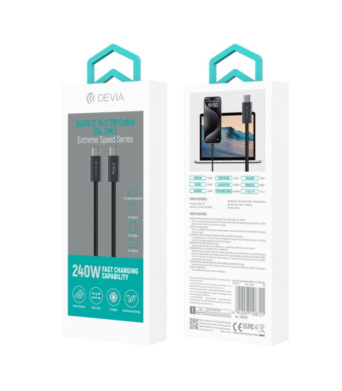 Kabel Devia Extreme 240W to potężna dawka zasilania dla twoich urządzeń. Inteligentny chip dostosowuje napięcie do urządzenia i zapewnia bezpieczne ładowanie. Szeroka kompatybilność pozwala na ładowanie telefonu, laptopa, tableta czy konsoli. Szybkość przesyłu danych to 480Mbps. Plik o wielkości 1G prześlemy w 30s. Przewód pokryty jest splotem nylonowych włókien. Jest wytrzymały, odporny na pękanie i nie plącze się.