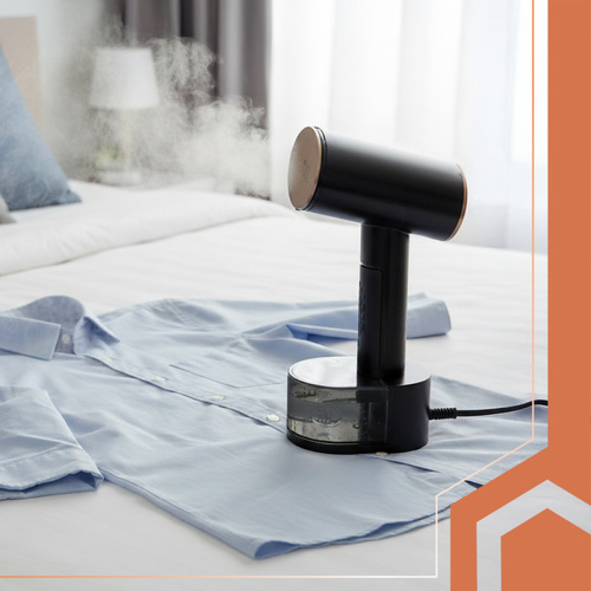 - praktisks piederumu komplekts – bikses klips un birste 2 vienā, ūdens mērtrauciņš un ceļojumu maciņš – padara tvaicētāju neaizstājamu mājās un ceļojumos