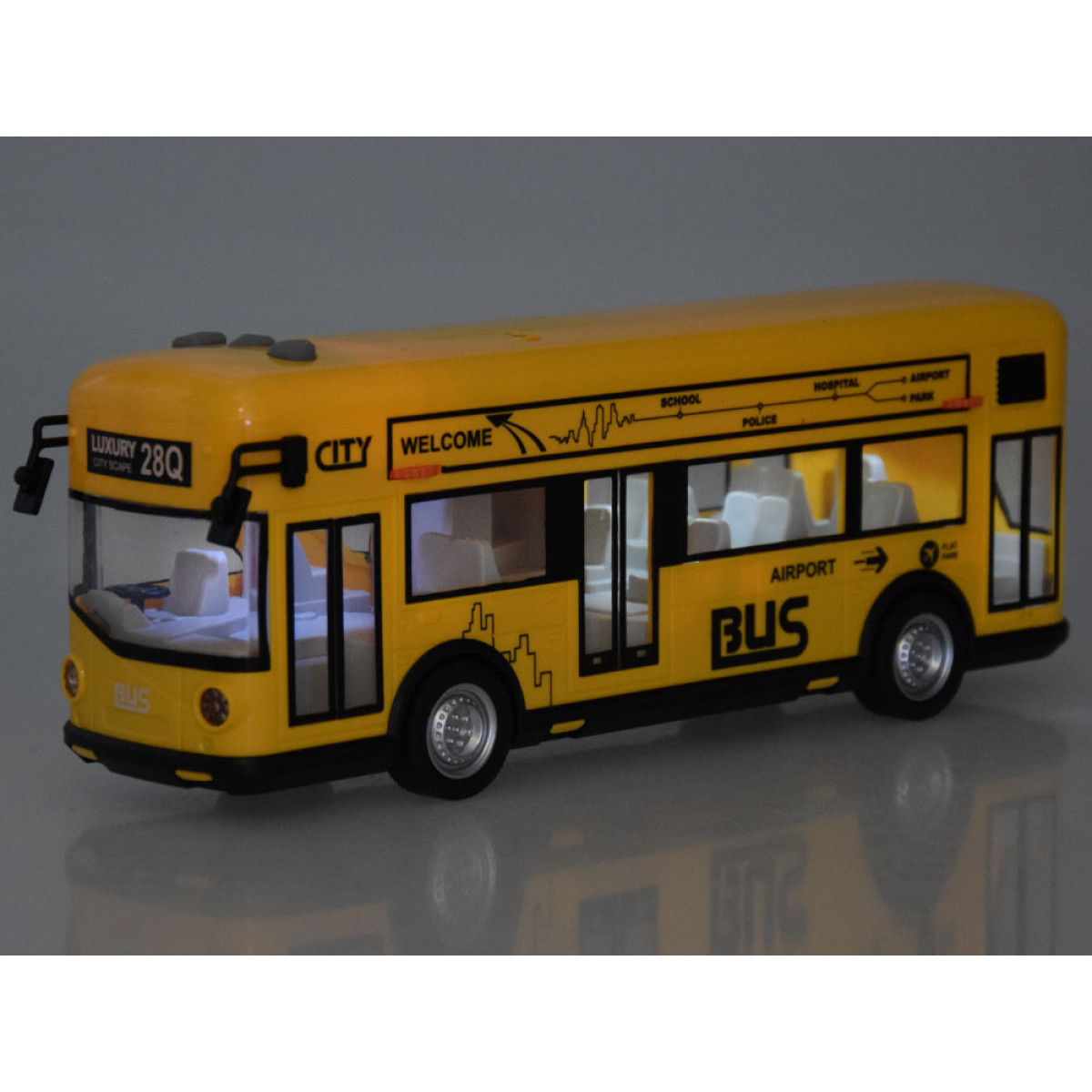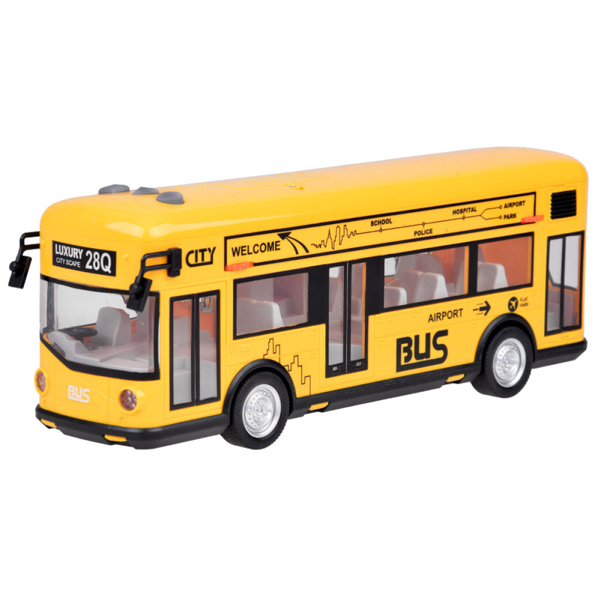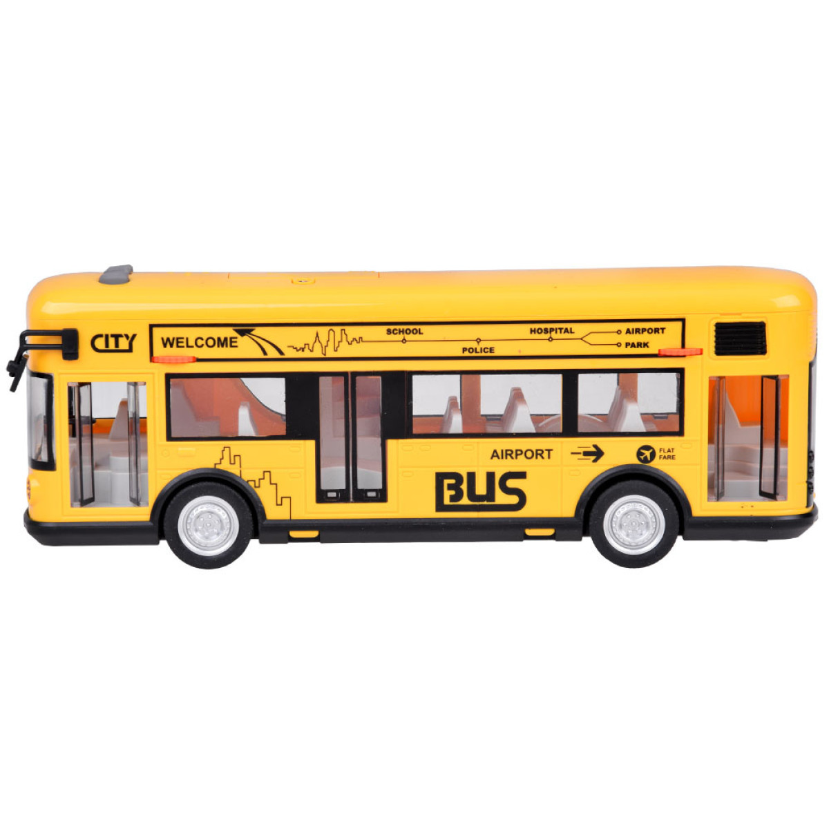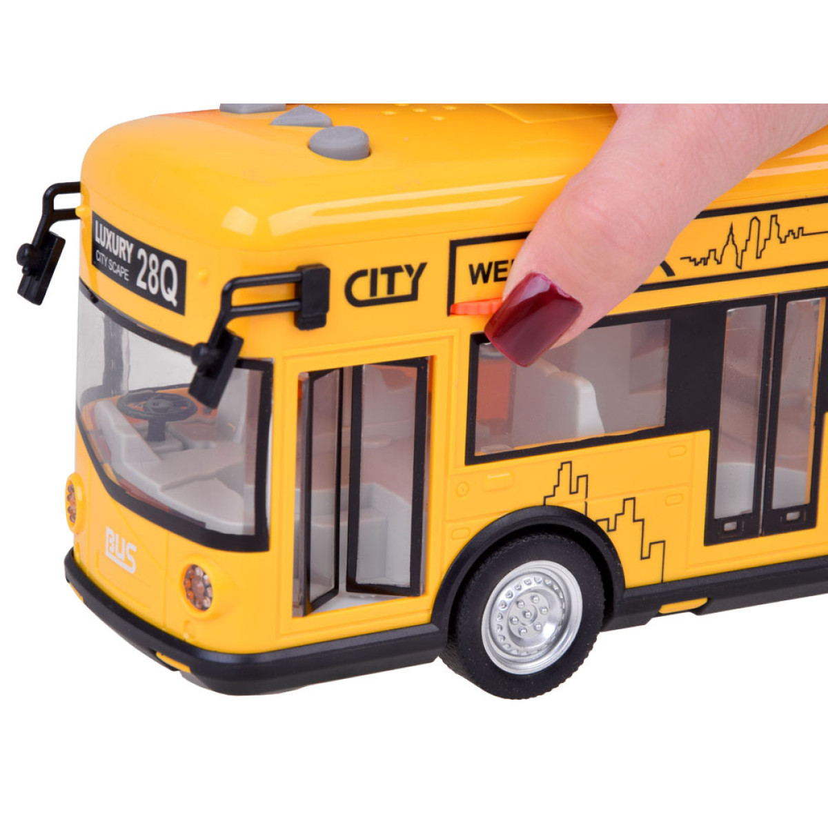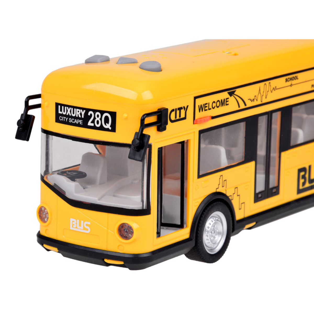 Transportlīdzeklis izgatavots no augstas kvalitātes plastmasas, intensīvā dzeltenā krāsā. Spēles prieku papildina skaņas un gaismas efekti. Turklāt priekšējās un aizmugurējās durvis var atvērt ar riteņa palīdzību, kas atrodas virs ieejas. Autobuss darbojas uz spiediena - pietiek to iespiest uz līdzenas virsmas un palaist, lai tas skrietu uz priekšu. Riteņi ar gumijas riepām nodrošina saķeri ar dažādām virsmām. Gatavi spēlei? Tad braucam!