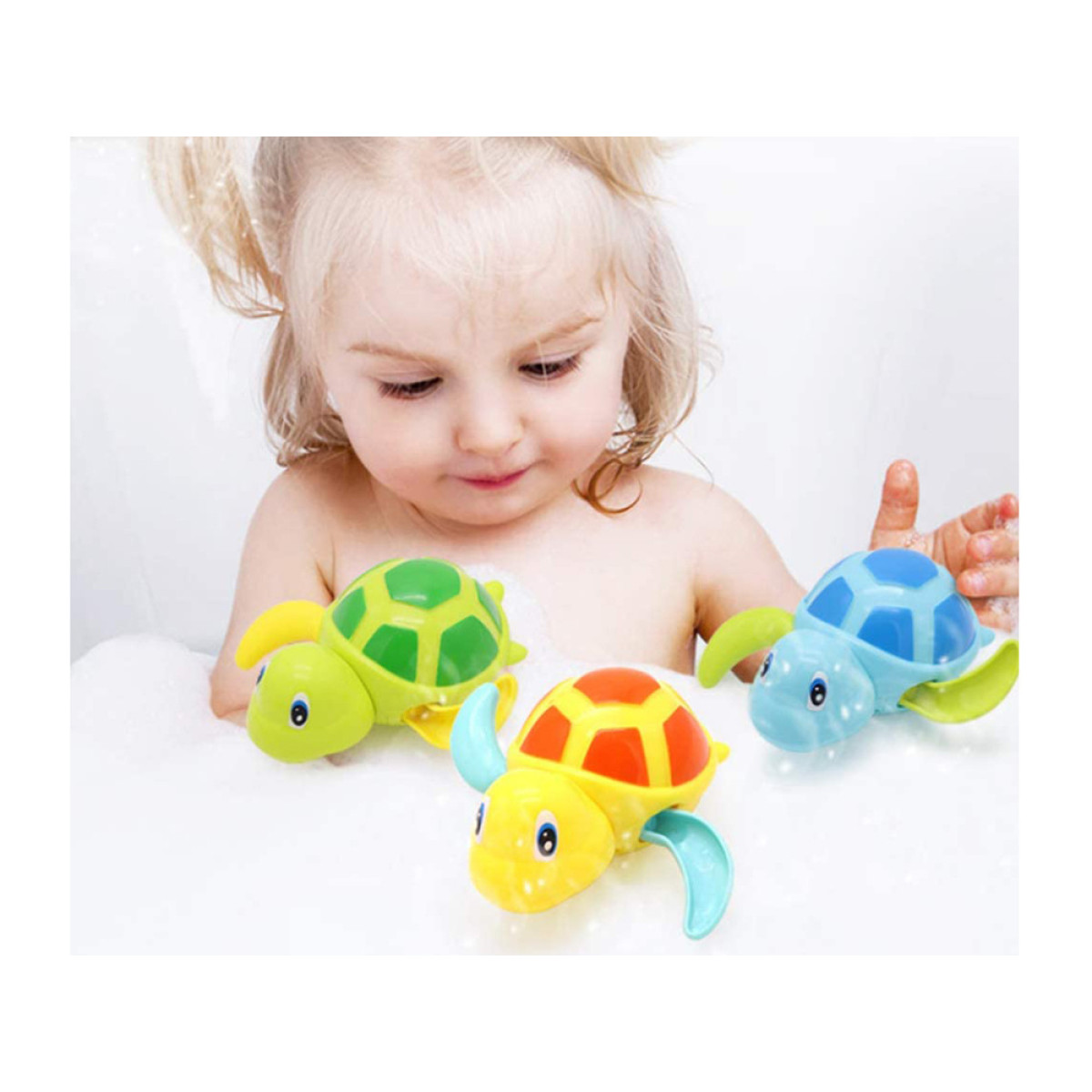 Lai bruņurupucis sāktu kustēties, ir nepieciešams to uzvilkt. Bērns varēs vērot, kā bruņurupucis drosmīgi peld cauri putām, kā arī izdomāt dažādus piedzīvojumus. Lieliska izklaide garantēta!