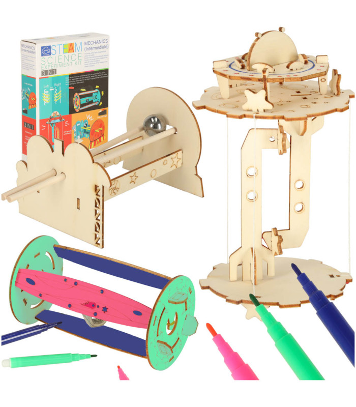 Pārvediet bērnu zinātnes pasaulē ar iedvesmojošu izglītojošu DIY komplektu! Tā ir unikāla rotaļlieta, kas ļauj veikt trīs zinātniskos eksperimentus, katrs no tiem ir aizraujošs ceļojums caur fizikas un mehānikas likumiem. Komplektā ietilpst elementi, kas ir izstrādāti, lai atvieglotu eksperimentu veikšanu bez papildu rīkiem. Koka elementi ir rūpīgi sagatavoti, lai tos varētu savienot bez līmes. Deviņi krāsaini marķieri, kas iekļauti komplektā, ļauj dekorēt katru modeli pēc savas iztēles.