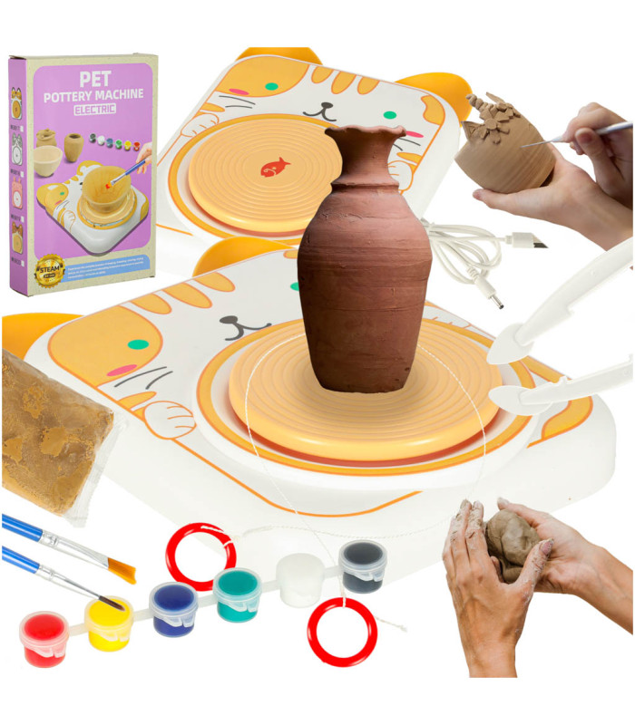 Prasmīgi sagatavotajā podnieku riteņa komplektā ir viss nepieciešamais, lai uzreiz sāktu piedzīvojumu ar keramiku. Komplektā ir elektriskais podnieku ritenis, mīksts māls, instrumentu komplekts un krāsas dekorēšanai, lai pabeigtu darbus. Tā ir pilnīga bāze veidošanai - atliek tikai izpakot un sākt darboties! Jaukais kaķa motīvs piesaista uzmanību un mudina uz radošu spēli.