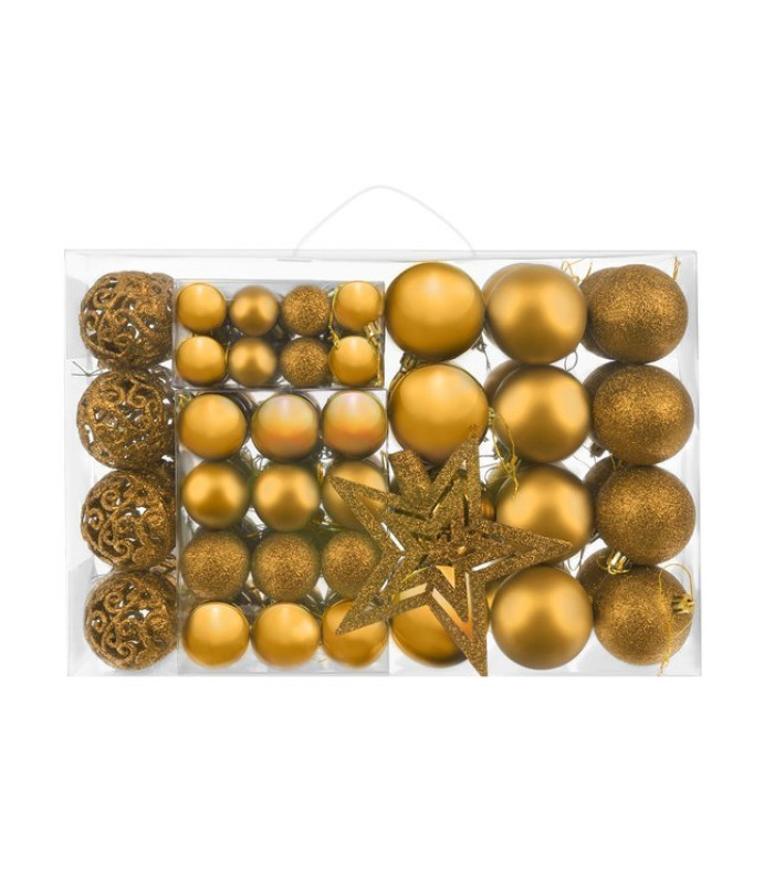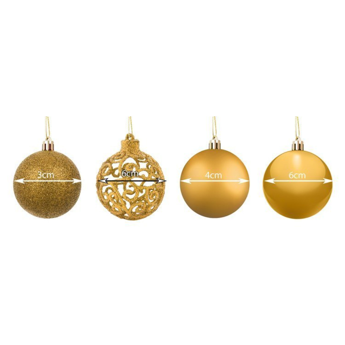 - Dažādi izmēri un veidi – komplektā ietilpst 4 klasiskie dizaini un 3 izmēri, kas patiks jebkuram. Rotājumi ir ar diametru 3, 4 un 6 centimetri. Tie ir matēti, gliteri un spīdīgi. Komplektā ietilpst arī efektīvi ažūra veidoti rotājumi. Skaista glitera zvaigzne būs ideāls papildinājums jūsu Ziemassvētku eglītei.