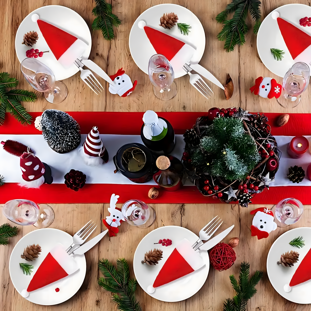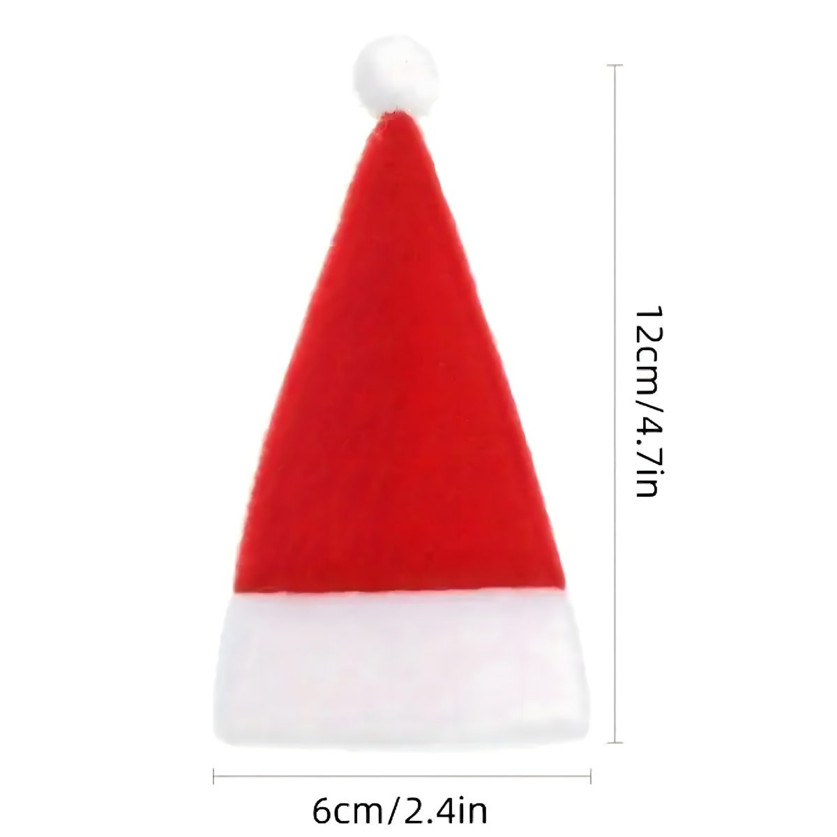 Komplekts ar 12 Ziemassvētku galda piederumu maciņiem cepures formā ir praktiska un efektīva galda dekorācija. Ar šiem maciņiem jūs radīsiet maģisku Ziemassvētku atmosfēru savā ēdamistabā, virtuvē vai viesistabā. Maciņi ir izturīgi, izgatavoti no auduma un mazgājami, un to universālais pielietojums padara tos lieliskus arī kā pudeļu dekorāciju.