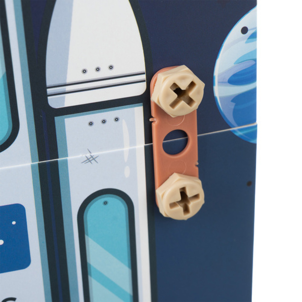 - Kosmosa tematika - raķetes, planētas un astronauta figūriņa iedrošina tēlot un veidot savus stāstus. 161 elementu ar tematiskām ilustrācijām un montāžas plāksnēm ar kosmosa motīvu.