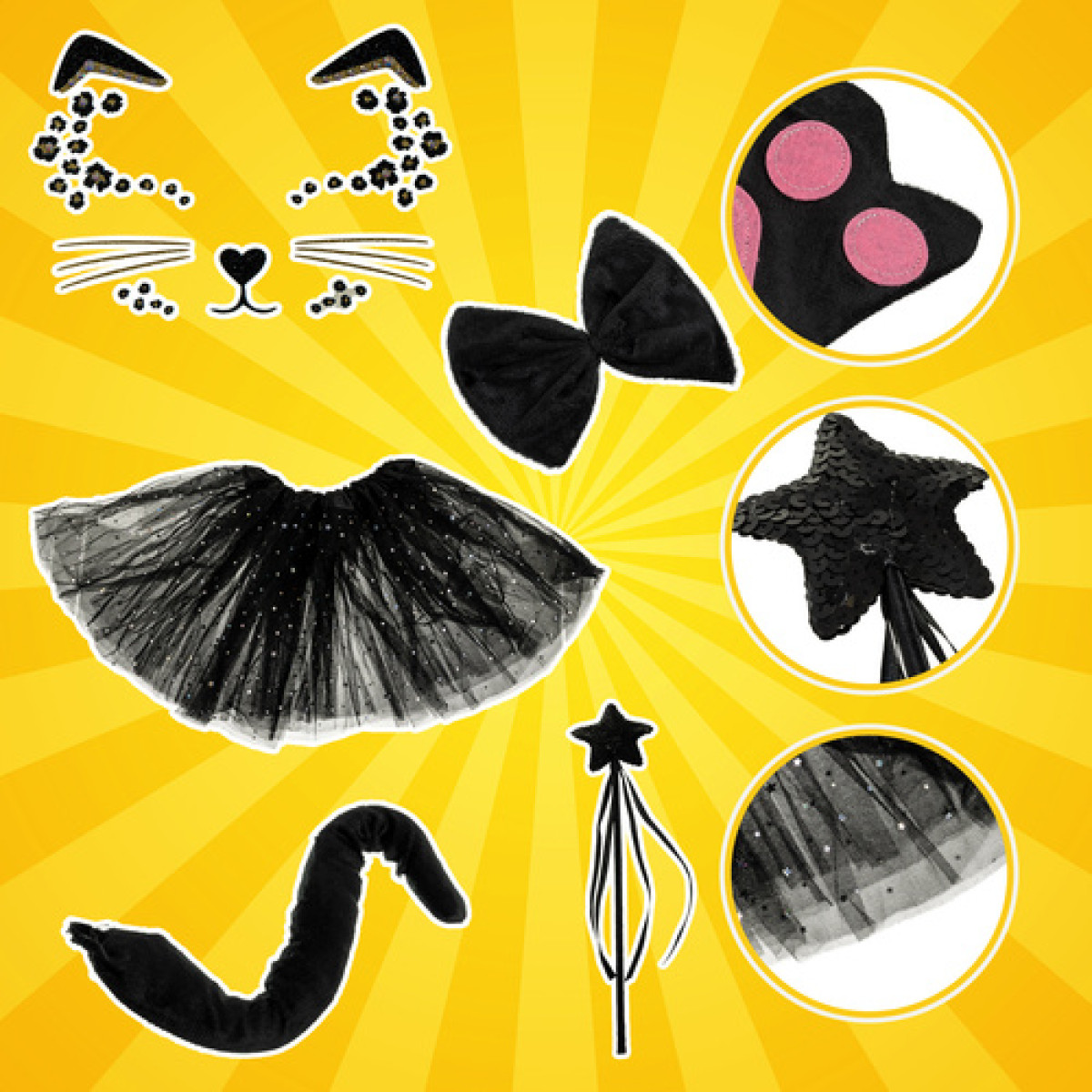 - pilnas komplektas - kostiumą sudaro net 7 elementai : sijonas, veido lipdukai, galvos juosta, burtų lazdelė, katės letenėlės, uodega ir peteliškė – viskas, ko reikia norint sukurti tobulą stilių