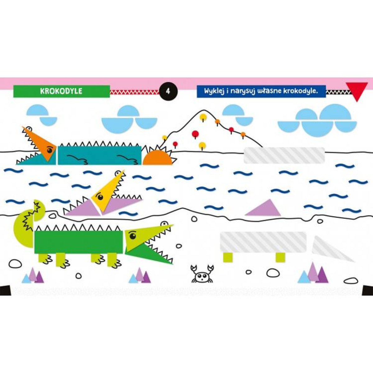 Līmējamie zīmējumi ar figūrām ir grāmatiņa radošiem bērnudārza bērniem. Bērns līmē uzlīmes un piezīmē elementus, veidojot zīmējumu ar ģeometriskajām figūrām.
