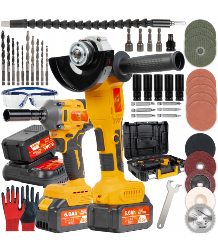 - 2 instrumenti vienā komplektā – triecienuzgriežņu atslēga un leņķa slīpmašīna ikdienas un profesionāliem darbiem.