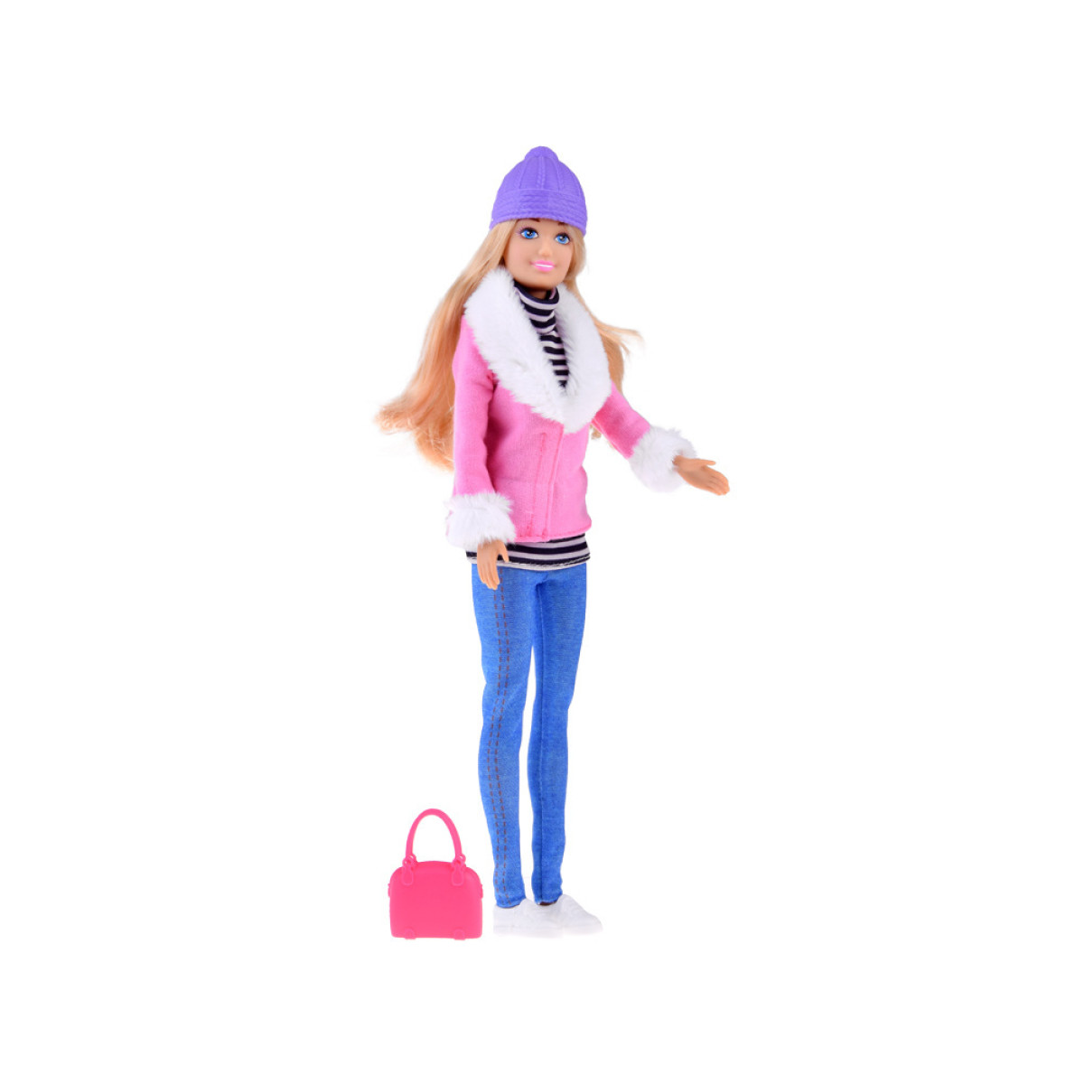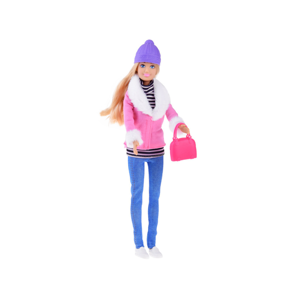 Eleganta lelle ar gariem blondiem matiem tērpta ziemas stilā, patiks jebkurai meitenei. Lellei ir skaisti gari mati, no kuriem var veidot modernus frizūras, un uz galvas ir violeta ziemas cepure. Lelle ir ģērbta stilīgā rozā jakā ar baltu kažokādu, un zem tās ir svītrains džemperis. Uz garajām kājām ir zilas legingas un uz kājām baltas zīmolu čības. Komplektu papildina rozā soma. Lelles ekstremitātes ir kustīgas, un tai ir smaidoša seja ar zilām acīm. Lelles augstums ir aptuveni 30 cm.