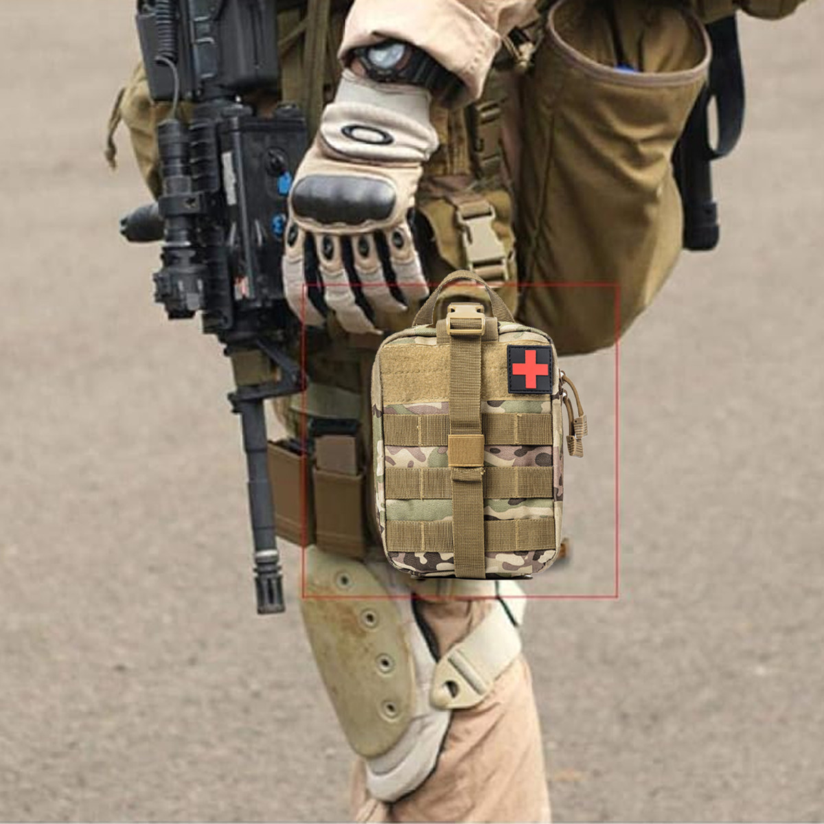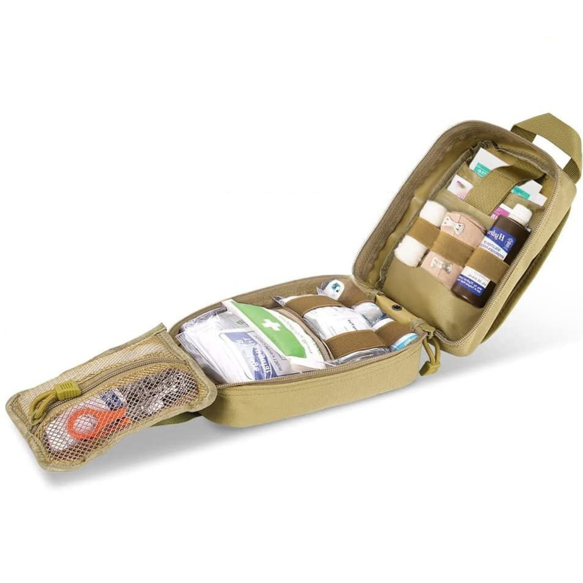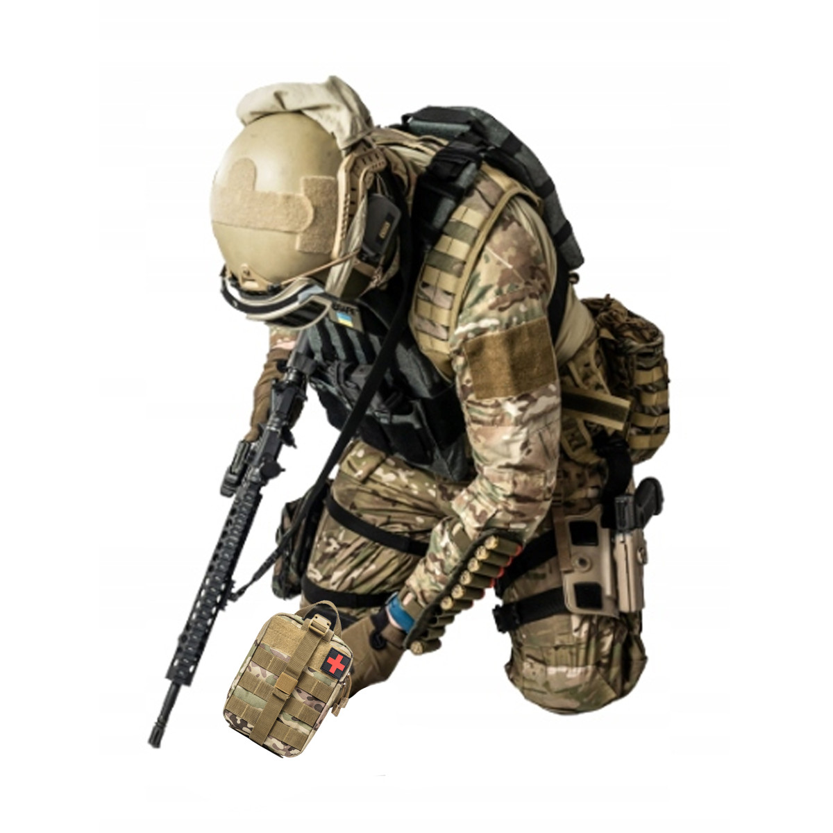 Pirmās palīdzības komplekts, kas paredzēts militāriem un izdzīvošanas vajadzībām, ir izgatavots no izturīga un ūdensnecaurlaidīga Cordura 600D materiāla, kas ir izturīgs pret nolietojumu un mitrumu.