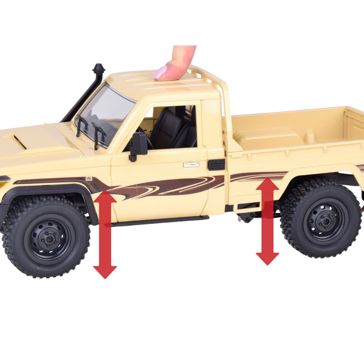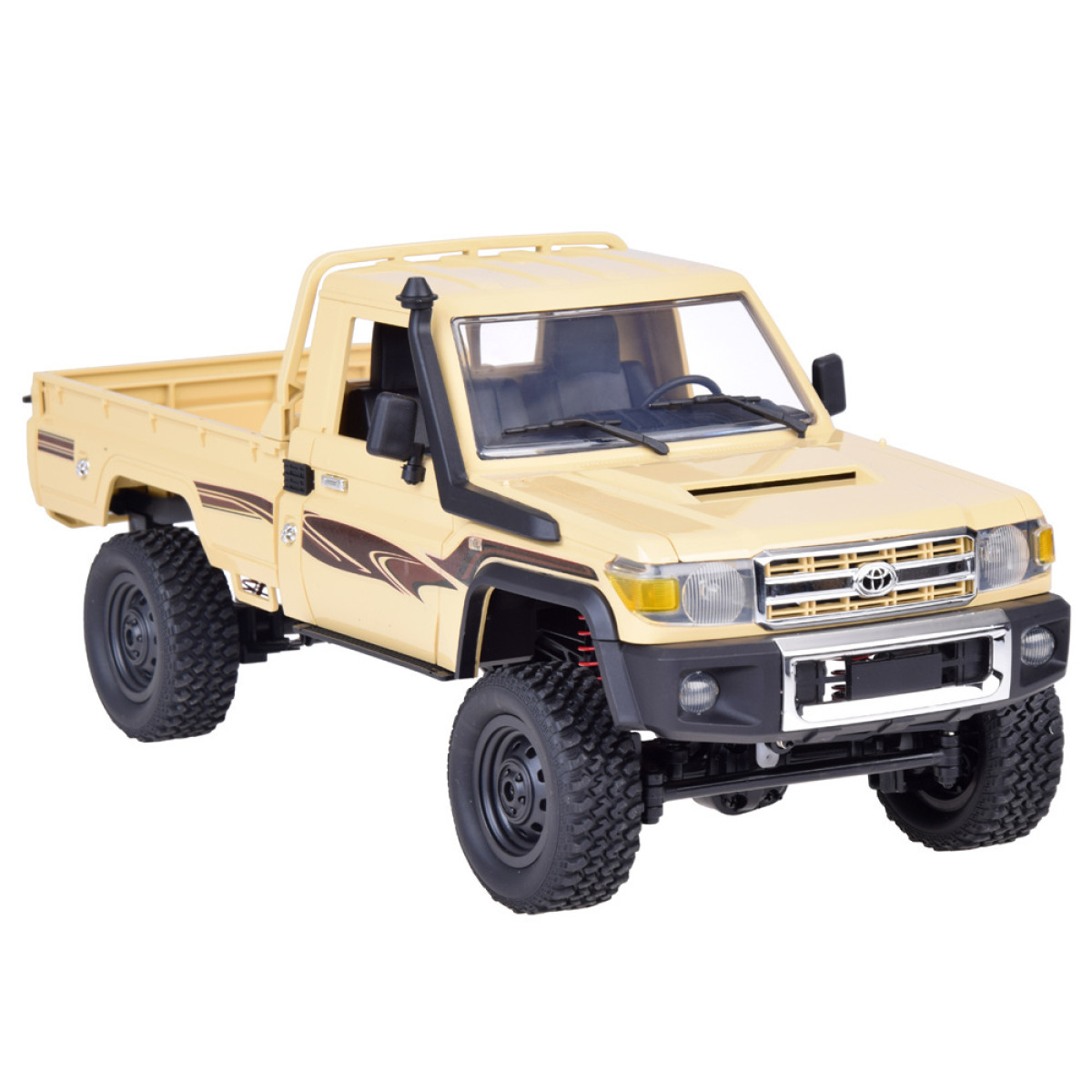 - Reālistisks Dizains: Detalizēta virsbūves apdare, atverama priekšējā motora pārsegs, piekabe aizmugurē, gumijas riepas un Toyota Land Cruiser raksturīgās detaļas.