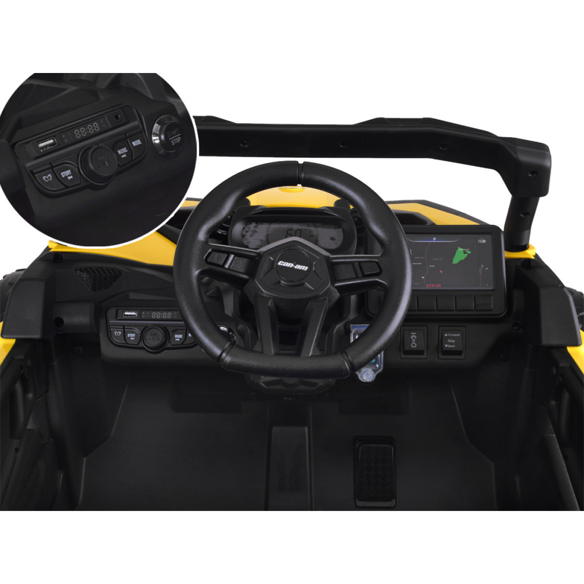 Stūres ritenī ir divas pogas - viena mūzikas pārslēgšanai, otra - signālam. Vadības panelī ir pogas auto iedarbināšanai, gaismas ieslēgšanai, ātruma izvēlei, braukšanai uz priekšu un atpakaļ, mūzikas pārslēgšanai un skaļuma regulēšanai. Ir arī MP3, USB ieejas, lai pieslēgtu savu mūzikas atskaņotāju, un bērns var klausīties savas iecienītās dziesmas un stāstus. Panelī ir arī baterijas uzlādes indikators un navigācijas imitācija.