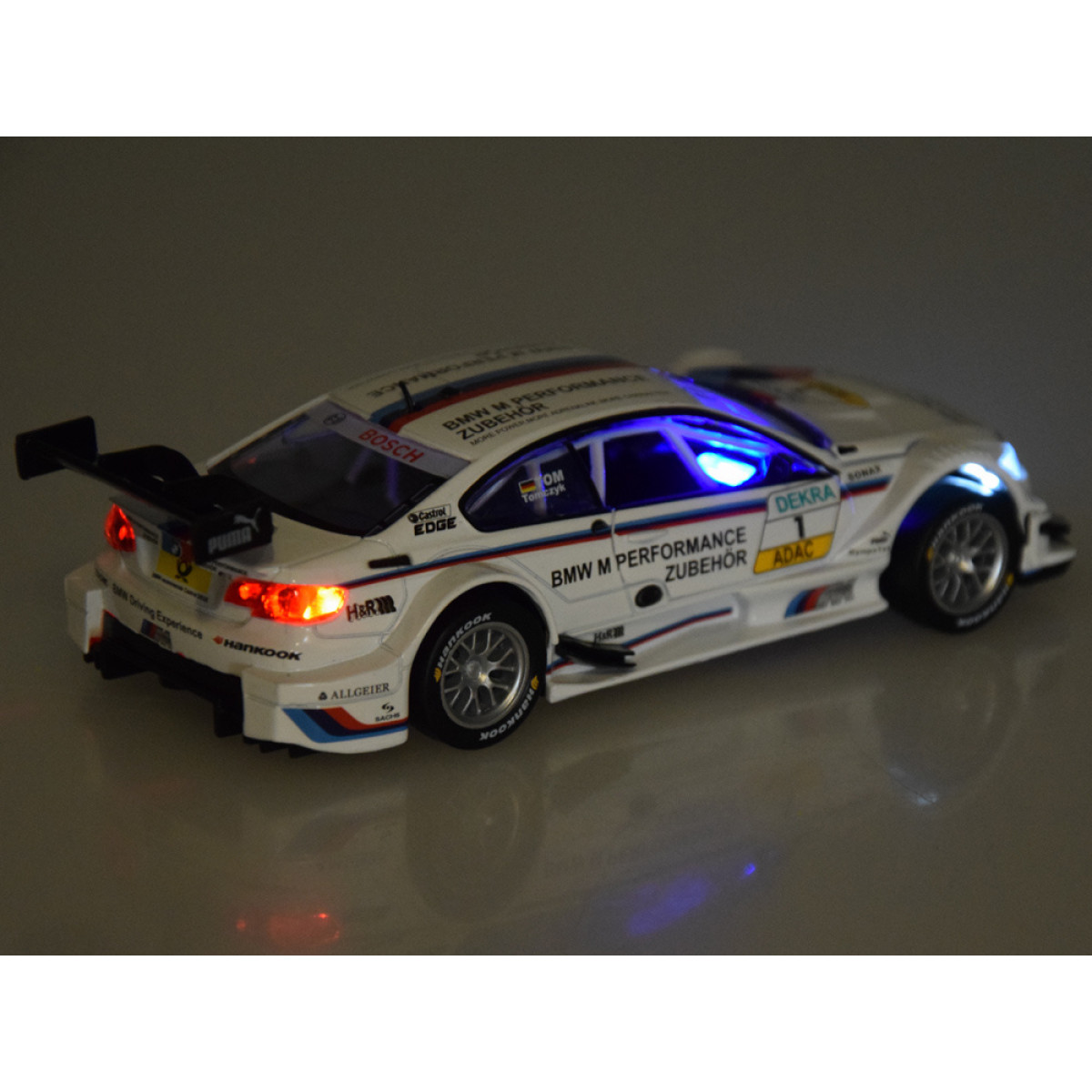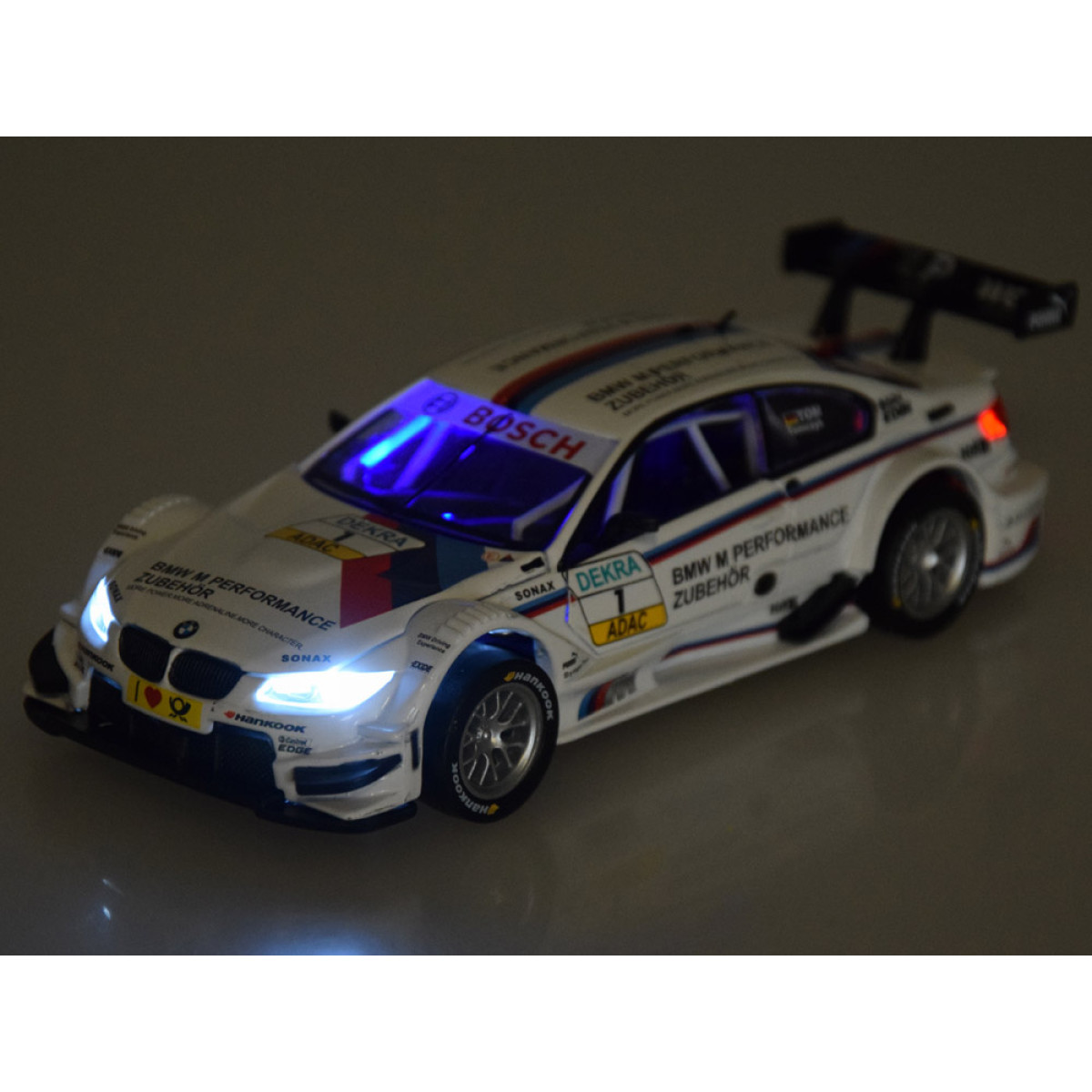 Atverot durvis BMW M3 DTM, dzirdēsit atvēršanas ar atslēgu skaņu. Nospiežot transportlīdzekli uz zemes, tiek aktivizēts iedarbināšanas un dzinēja darbības skaņas efekts. Skaņas efektiem pievienojas priekšējās un aizmugurējās gaismas, kā arī apgaismots instrumentu panelis. Visa transportlīdzekļa virsbūve ir metāla, riteņi ir gumijas, un šasija ir izgatavota no plastmasas.