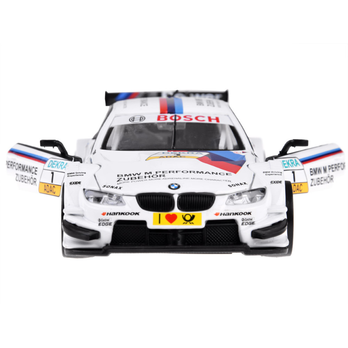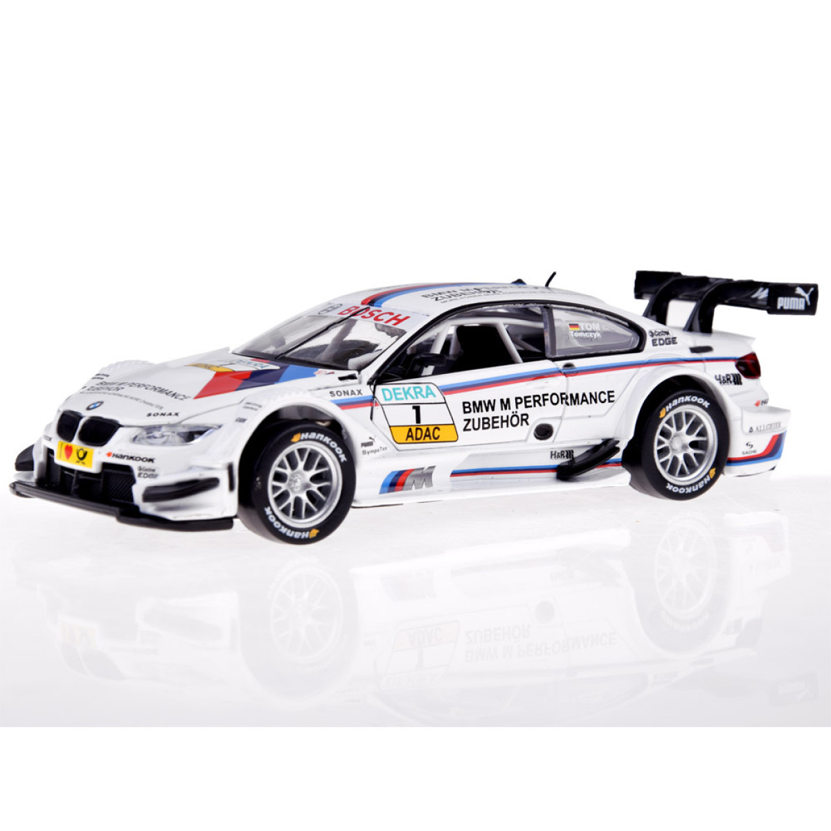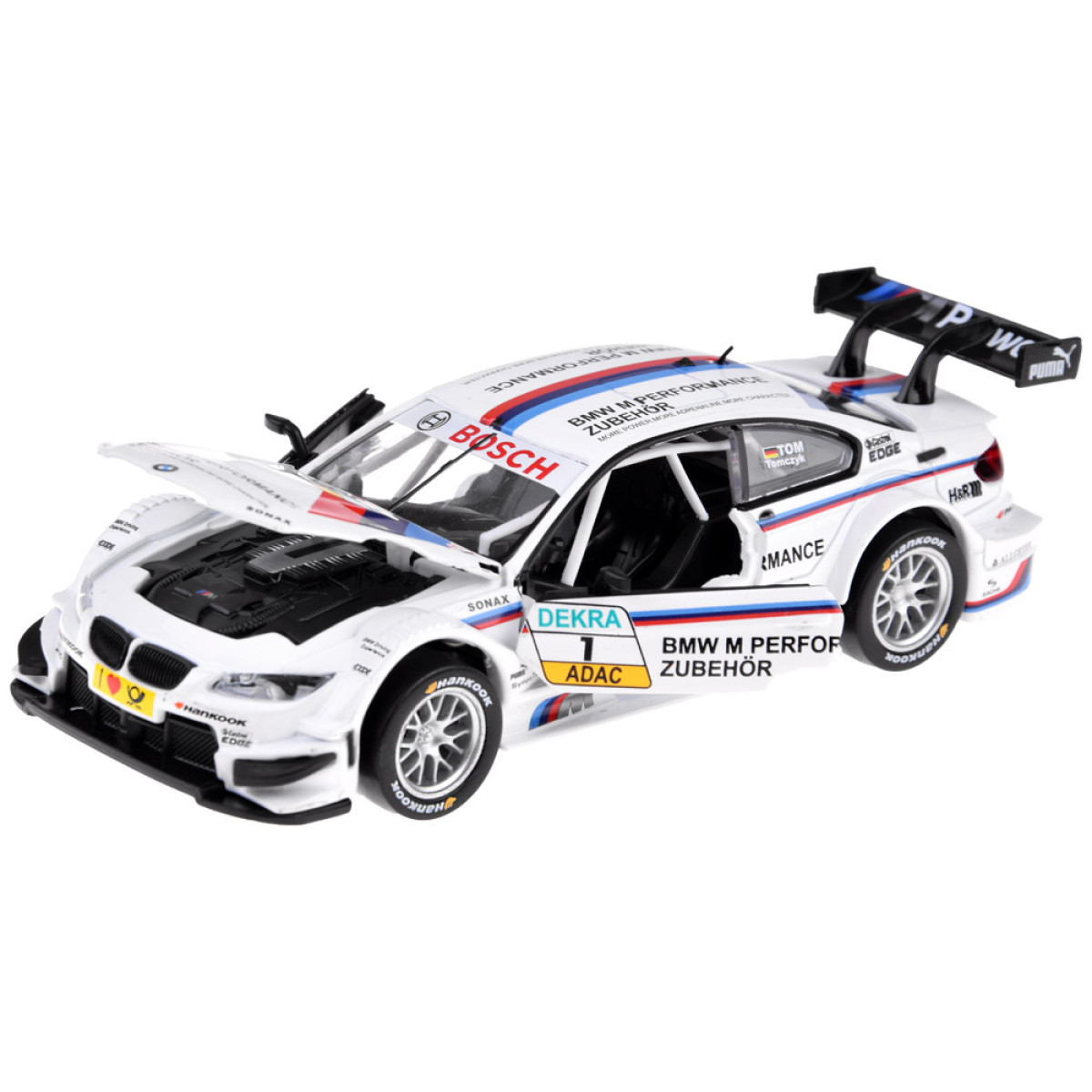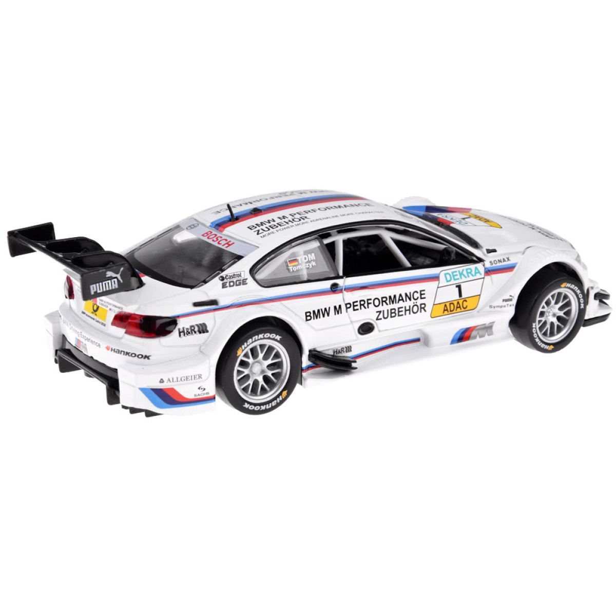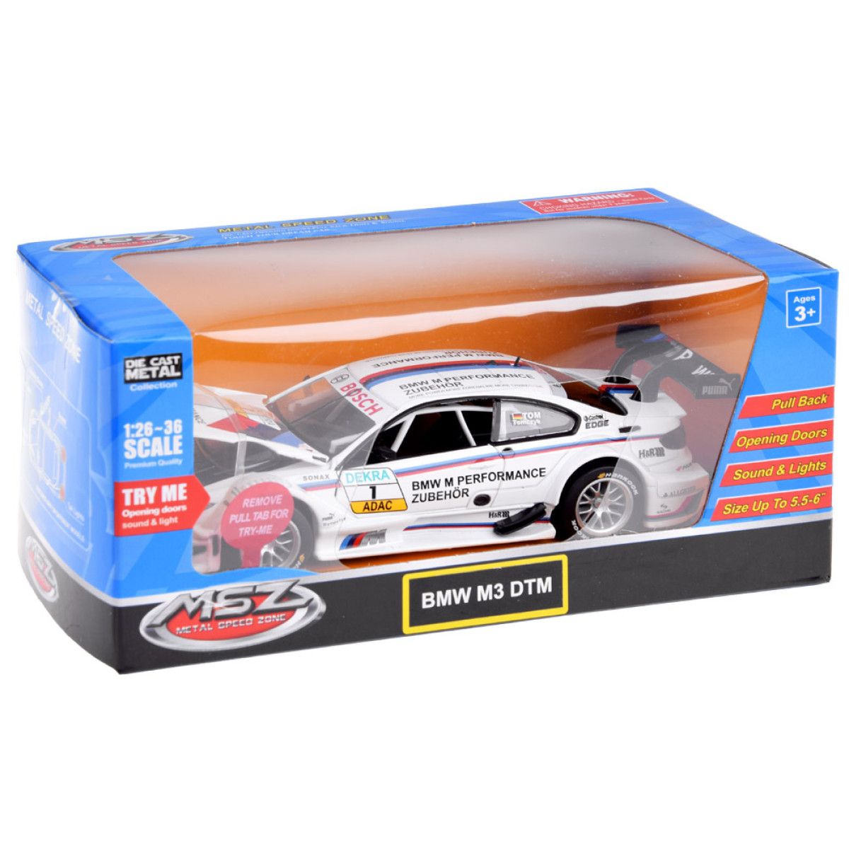 Auto BMW M3 DTM mērogā 1:32 ir lielisks papildinājums automobiļu modeļu kolekcijai. Sporta transportlīdzeklis ir rūpīgi un estētiski izstrādāts ar uzmanību detaļām, kas noteikti aizraus katru mazo autovadītāju. Auto ir atveramas durvis, kā arī skaņas un gaismas efekti. BMW ir aprīkots ar friction power piedziņu, kas ļauj tam pēc atvilkšanas uz gludas virsmas doties uz priekšu. Automašīna darbojas arī uz stumšanu.