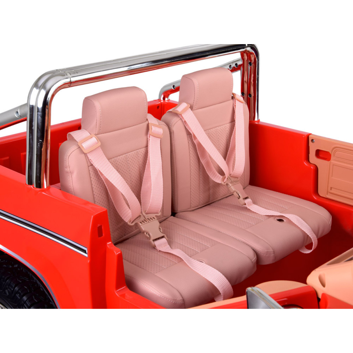 auto ir piemērots diviem bērniem un izstrādāts, domājot par komfortu un drošību. Tam ir vieta diviem bērniem, stūre kreisajā pusē kā īstā automašīnā, divas neatkarīgas 2 punktu drošības jostas un ergonomisks panelis ar akumulatora uzlādes līmeņa indikatoru.