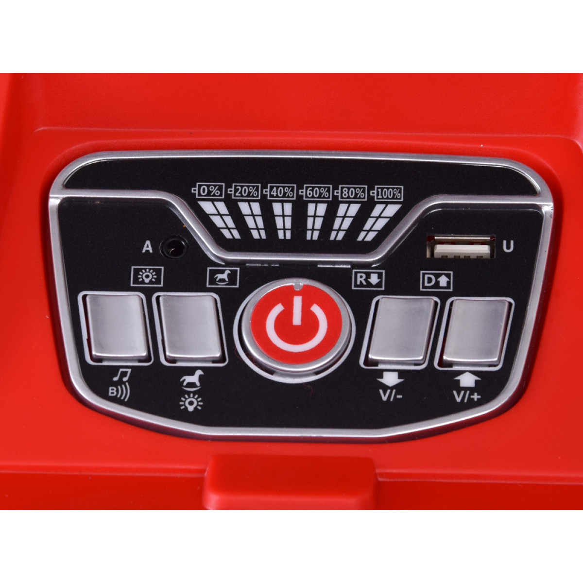 Mašīna tiek iedarbināta ar sarkanu pogu, kas rada dzinēja skaņu un krāsainus, mirgojošus gaismas efektus. Stūre ir aprīkota ar divām pogām - tauri un mūzikas pārslēgšanai. Zemāk atrodas multifunkcionāls panelis ar dažādām funkcijām, tostarp USB un Mp3 ieejām, kas ļauj bērnam klausīties iecienītās dziesmas.