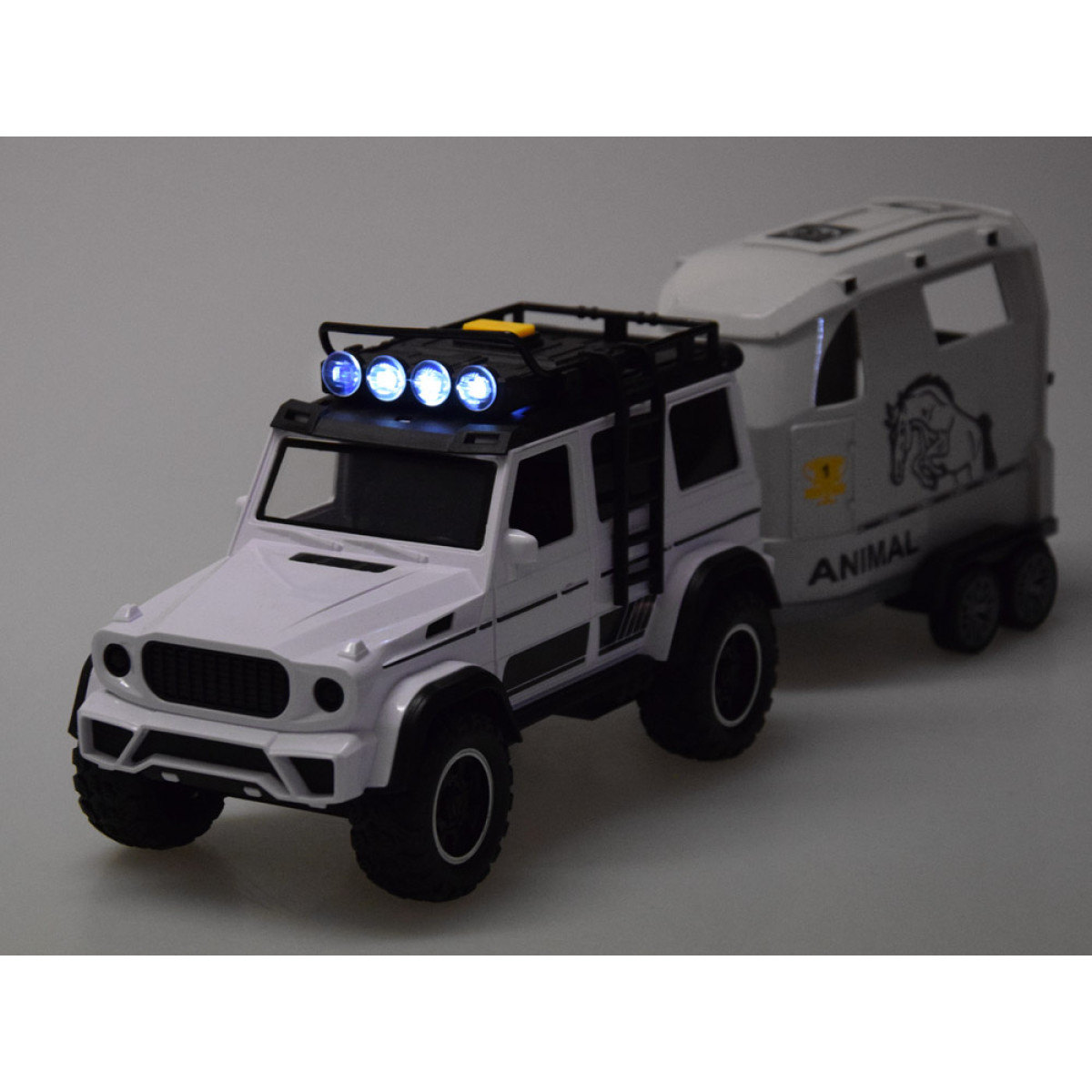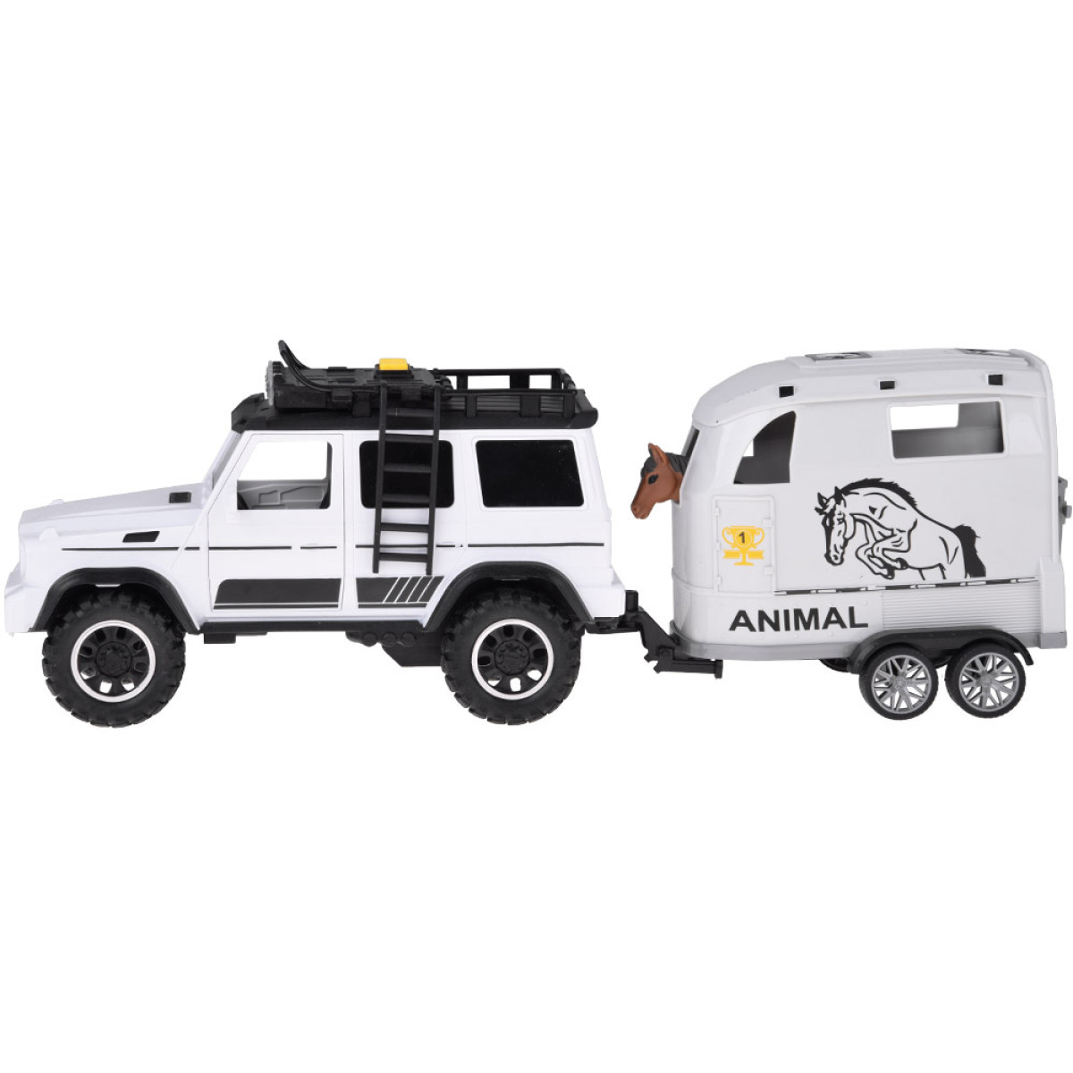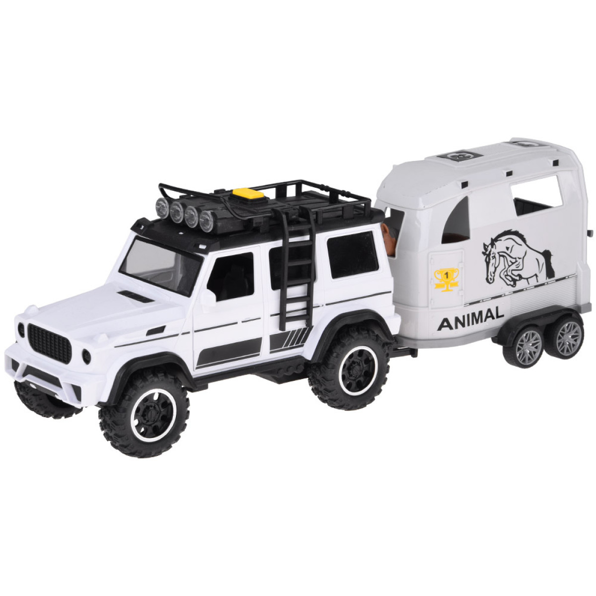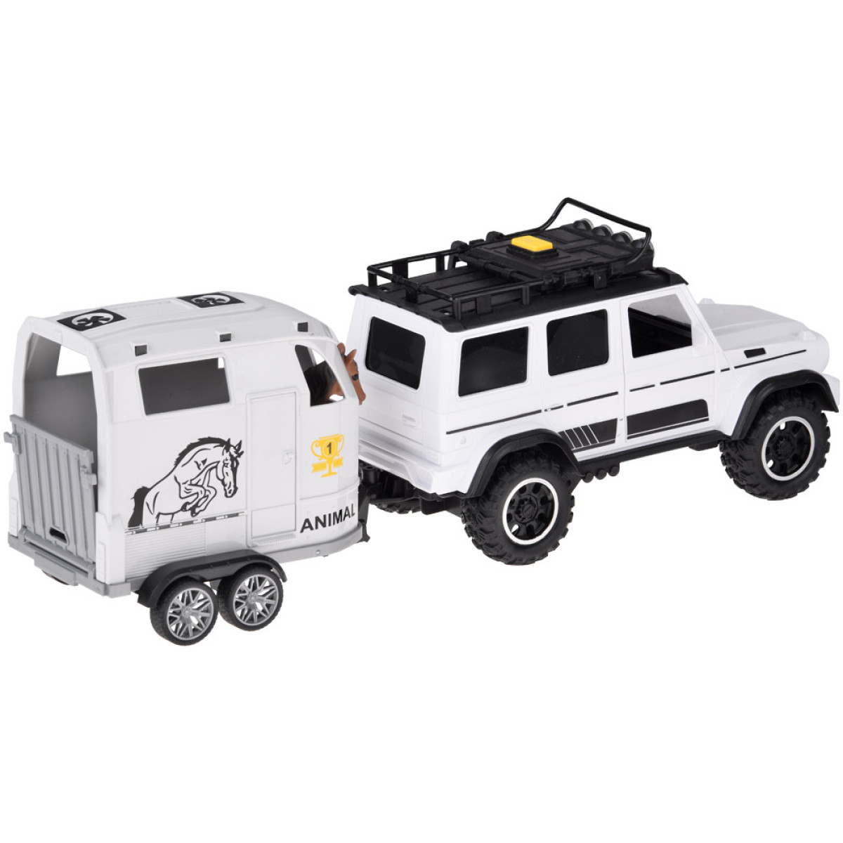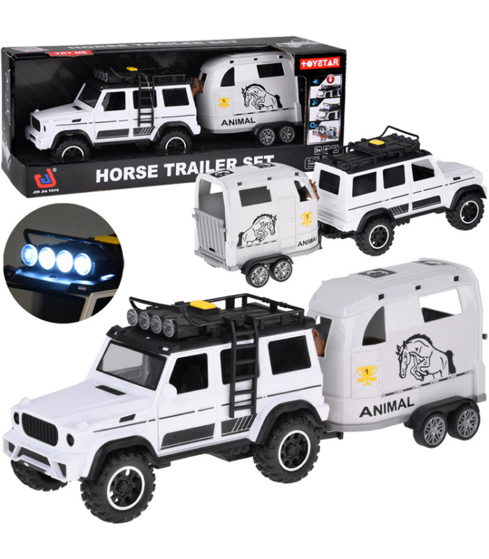 Šis ir lielisks piedāvājums bērniem, kuriem patīk gan transportlīdzekļi, gan dažādu rotaļlietu pārvadāšana! Komplektā ir interaktīva, baltā krāsā auto terenowe ar melniem akcentiem un gaiša, noņemama piekabe bucka. Šī piekabe ir paredzēta drošai zirgu pārvadāšanai, tomēr bērns tajā var pārvadāt jebko, ko vēlas!