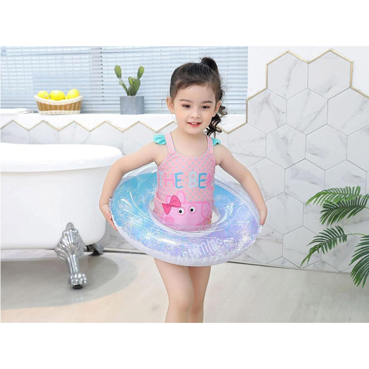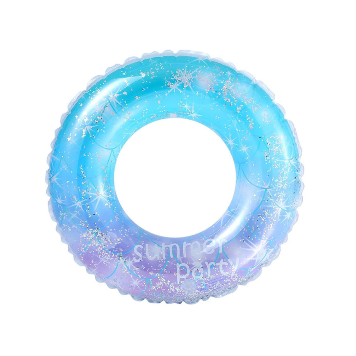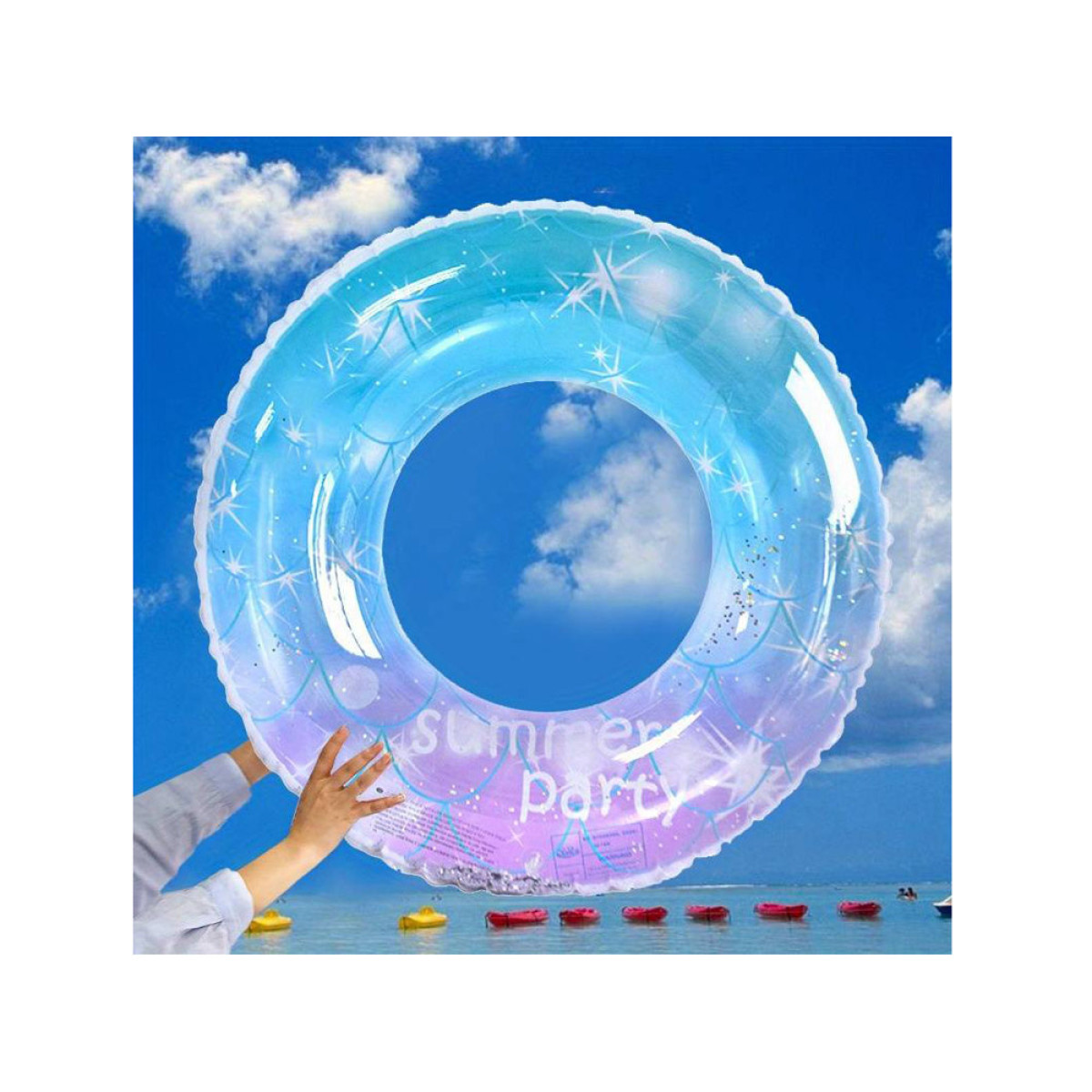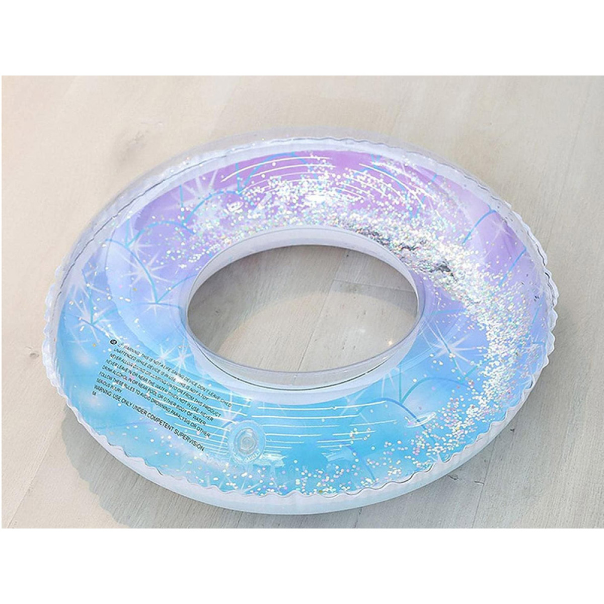 Moderna, daļēji caurspīdīga peldēšanas aplis ar mirdzošiem spīguļiem iekšpusē ir vasaras hits! Nav cilvēka, kurš nepamanīs jūsu piepūšamo apli!