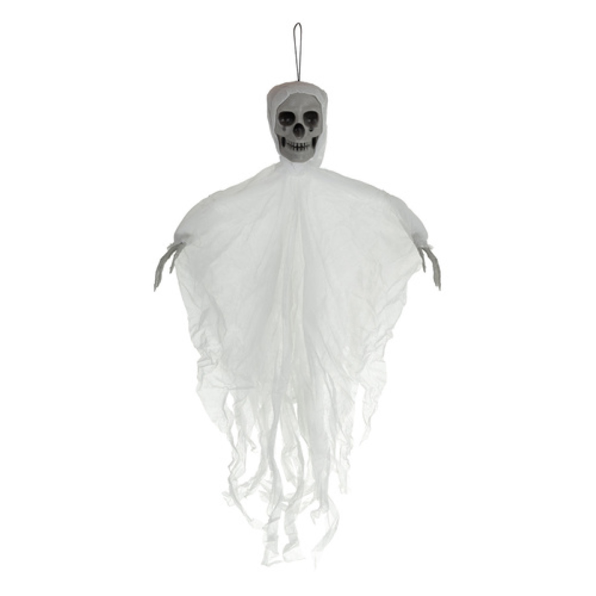 Reālistisks skelets ar galvaskausu un saplēstu audumu ir dekorācija, kas uzreiz rada šausmu atmosfēru. Pateicoties vieglajai konstrukcijai un cilpai, to var pakārt jebkurā vietā - pie griestiem, durvīm, lampas vai dārzā. Vējā kustīgais audums rada svārstīga gara ilūziju, bet lielais izmērs padara skeletu par centrālo dekorācijas punktu. Ideāli piemērots Halloween, tematiskiem pasākumiem vai scenogrāfijai - gatava dekorācija, kas vienmēr piesaista skatienus.