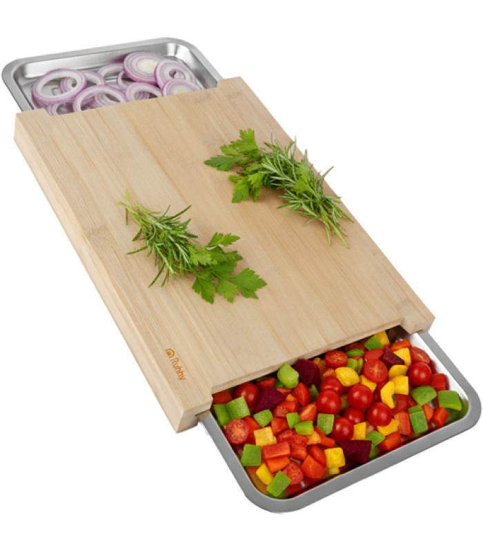 Bambusa dēlis Ruhhy ar izvelkamiem konteineriem - ērti griešanas un organizēšanas risinājumi virtuvē.