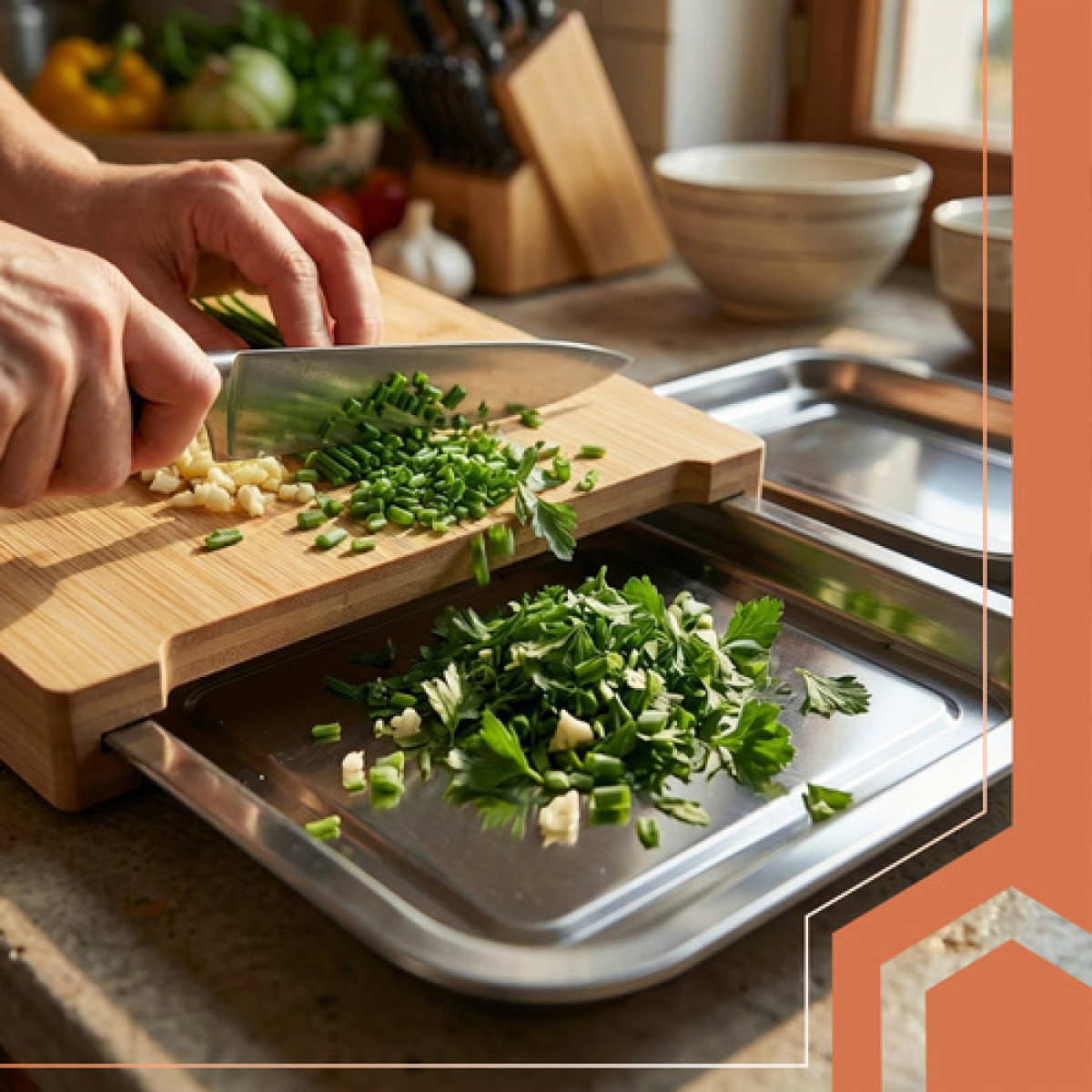 Dēlis atvieglo sastāvdaļu griešanu, šķirošanu un pārvietošanu. Ar diviem izvelkamiem konteineriem darbs notiek ātrāk un tīrāk. Dabīgais bambuss izceļas ar izturību, mitruma izturību un elegantu izskatu, savukārt tērauda konteineri ļauj ērti uzglabāt sagrieztos produktus vai atkritumus. Tas ir funkcionāls virtuves piederums, kas uzlabo gatavošanu gan mājās, gan gastronomijā.