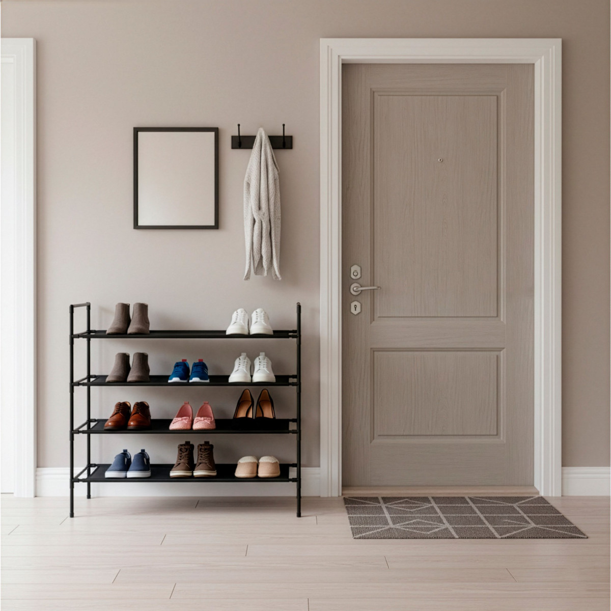 Šis 75x72x28 cm apavu plaukts ar četriem līmeņiem ir ideāls veids, kā sakārtot un viegli piekļūt apaviem. Tā metāla konstrukcija nodrošina stabilitāti un izturību – uz plaukta var droši uzglabāt pat smagākus ziemas zābakus. Četri līmeņi nodrošina pietiekami daudz vietas jūsu apaviem. Plaukta melnā virsma piešķir tam elegantu un minimālistisku izskatu, padarot to ideāli piemērotu dažādiem interjera stiliem. Plaukti ir pietiekami dziļi, lai tajos ietilptu lielāki apavu pāri.