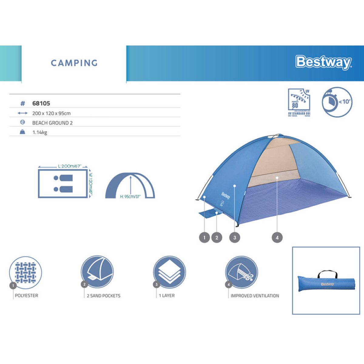 Ar Beach Ground 2 telti jūs būsiet aizsargāti no saules starojuma, kad atpūšaties pludmalē vai veicat pauzi dienas garumā ekskursijā. Pēc salikšanas tā aizņem maz vietas mājās un vienmēr ir gatava jaunam piedzīvojumam.