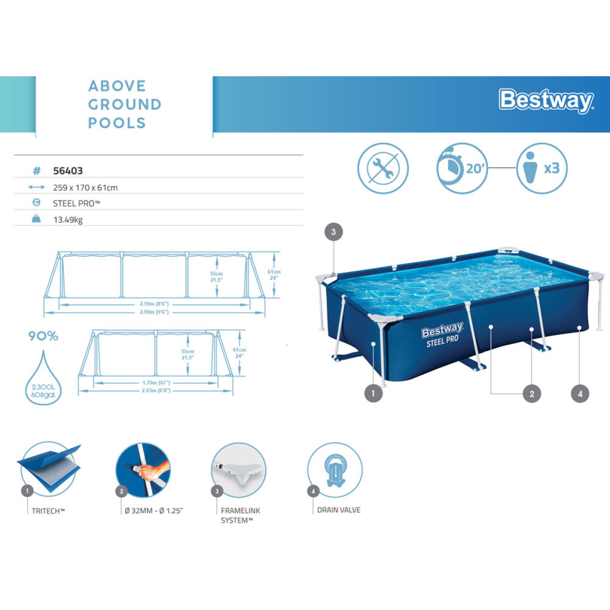 - Izmēri un Tilpums: Baseina izmēri ir 259 x 170 x 61 cm, un tas var saturēt 2,300 litru ūdens, kas ir ideāli piemērots bērniem.