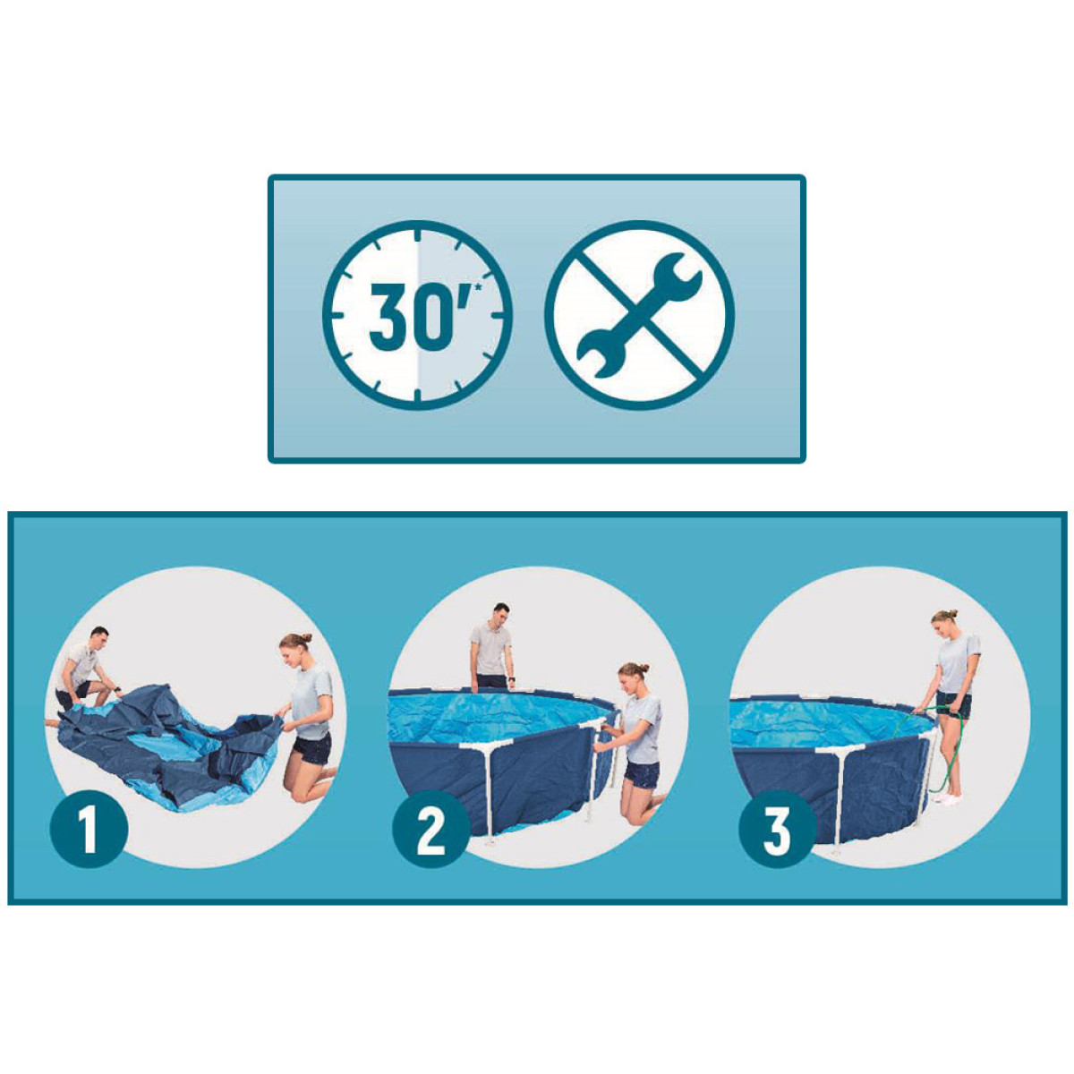 - Augstākās kvalitātes, pret koroziju izturīgs cinkots tērauda rāmis, kas nodrošina baseina stabilitāti. Ātrās savienošanas vadības vārsti. Ļoti vienkārša un ātra montāža bez instrumentiem!