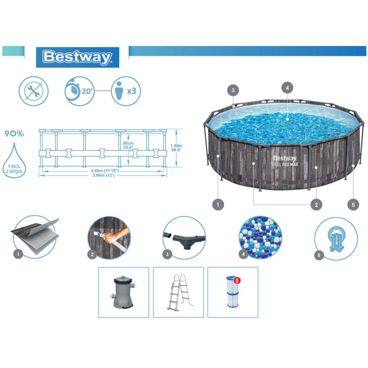 Izmēros 366 x 100 cm, Baseins Steel Pro MAX™ nodrošinās daudz atvēsinošas atpūtas karstās, vasaras dienās un piedāvās daudz prieka visai ģimenei. Privātais dārza baseins ir pietiekami plašs, lai to varētu izmantot gan bērni, gan pieaugušie.