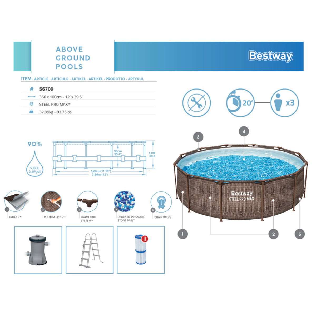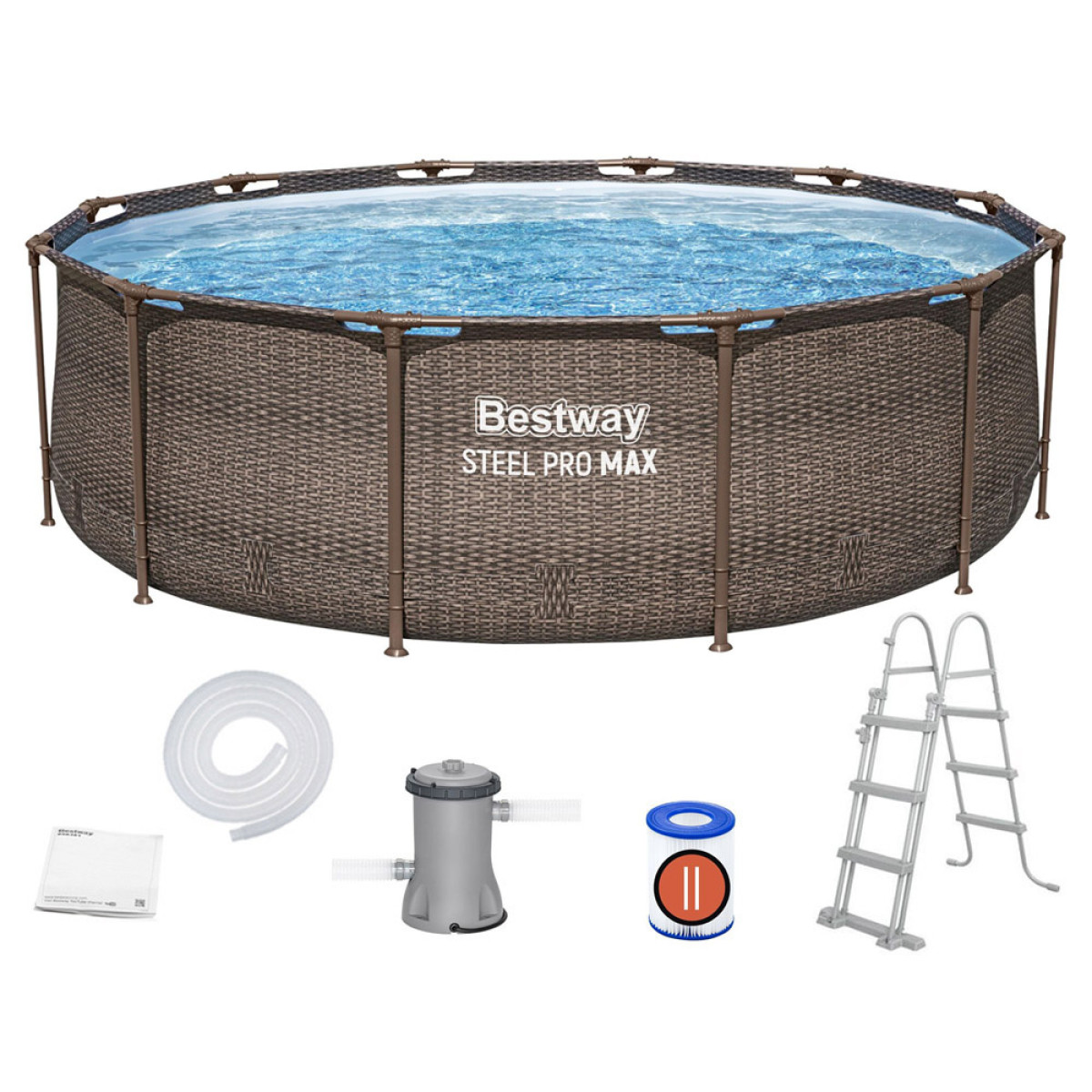 Bestway karkasa baseins Steel Pro MAX™ no rotangpalmas kolekcijas ar izmēriem 366 x 100cm un ietilpību 9,150l nodrošinās atsvaidzinošu atspirdzinājumu karstā dienā. Privātais dārza baseins ir tik plašs, ka no tā varēs izbaudīt gan bērni, gan vecāki. Unikālais baseina dizains, kas imitē rotangpalmu, lieliski saskanēs ar jebkuru dārzu.