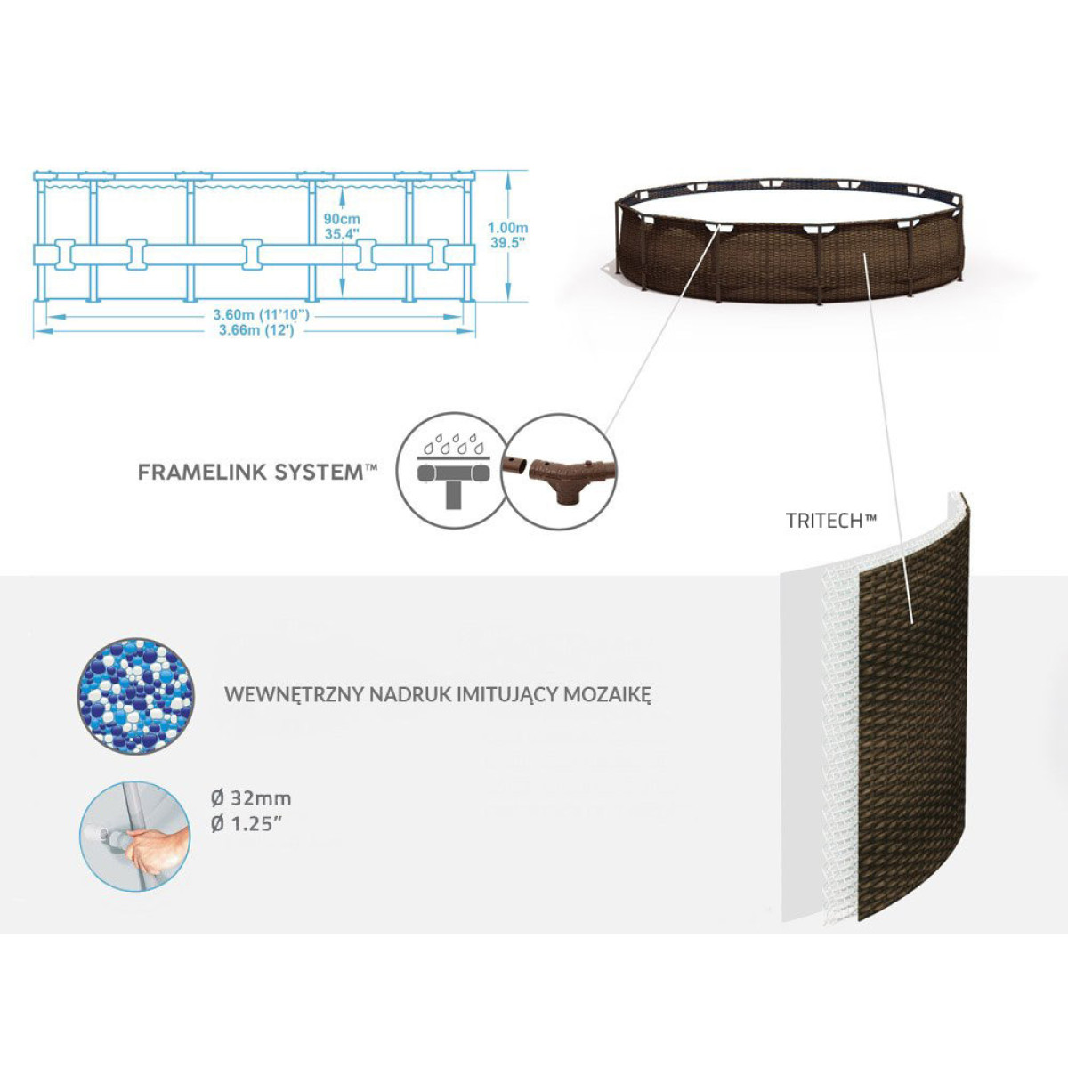 Baseina bļoda ir izgatavota no izturīga materiāla DuraPlus™. Tas ir materiāls ar poliestera tīkla kodolu, kas savienots ar diviem PVC slāņiem ar augstu biezumu. Tas nodrošina maksimālu izturību un noturību pret hloru un saules stariem. Īpašais metāla karkass ir izturīgs pret lietu un mainīgiem laikapstākļiem. Pateicoties īpašiem savienotājiem FrameLink System™, karkass ir aizsargāts pret koroziju metāla savienojumos.