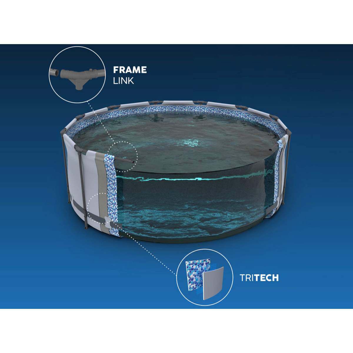 Baseins ir aprīkots ar drošu kāpnēm, kas ļauj viegli noņemt pakāpienus, kad tas netiek izmantots, tādējādi novēršot bērnu piekļuvi bez uzraudzības. Ūdens daudzums - 10,250 litri, kas ļauj baudīt niršanu.