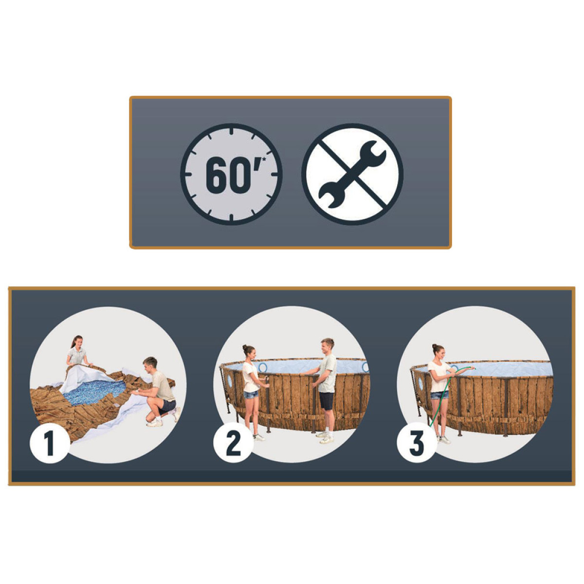 Augstākās kvalitātes, pret koroziju izturīgs, cinkots tērauda rāmis, kas nodrošina baseina stabilitāti. Apaļā forma nodrošina vieglu uzstādīšanu, lielāku stabilitāti un mazāk izniekotas vietas, jo baseinam nav nepieciešams sānu atbalsts. Montāžu var veikt bez instrumentiem!