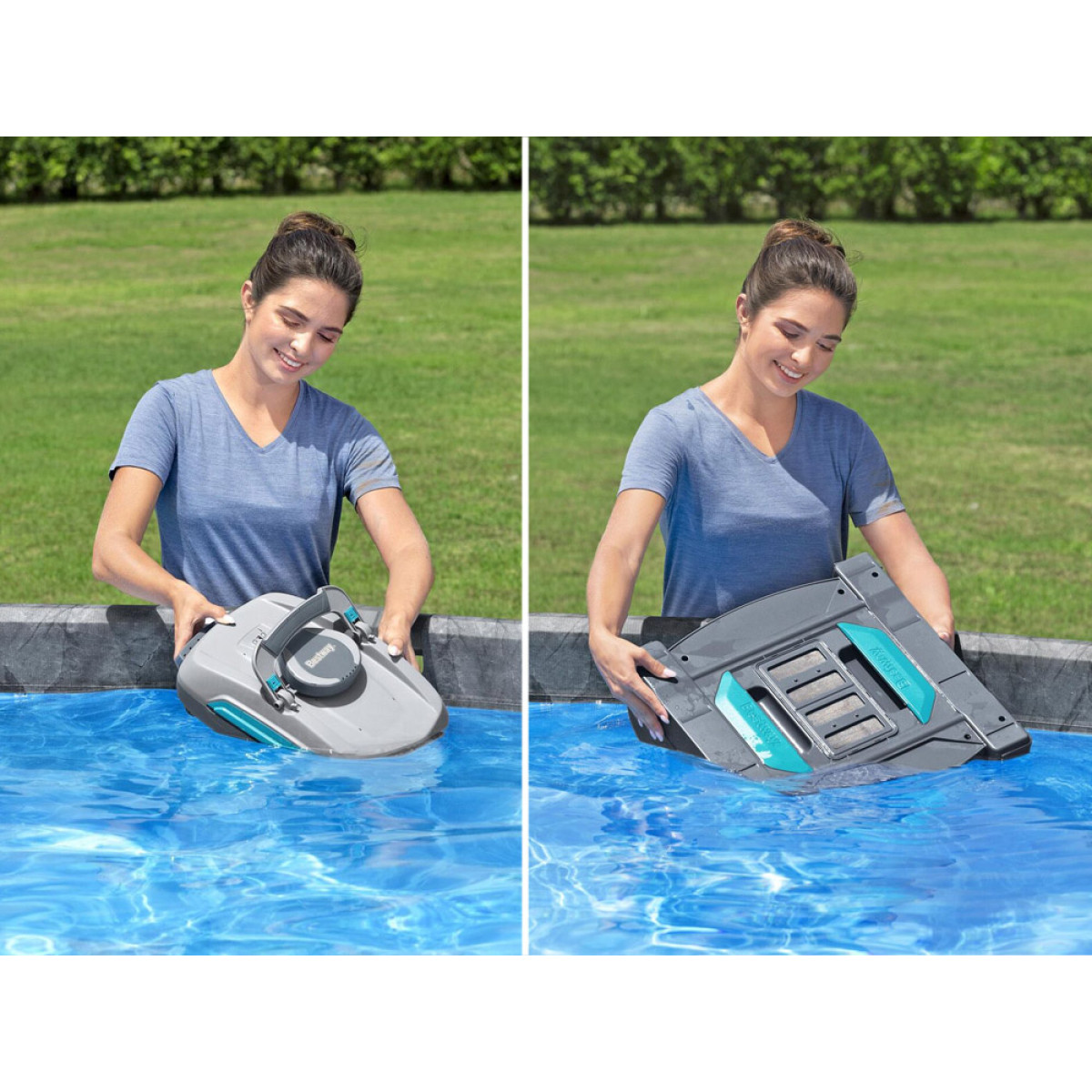 Inteliģentie sensori: Uzlaboti sensori aktivizē ierīci pēc pilnīgas iegremdēšanas ūdenī un automātiski to izslēdz pēc izņemšanas no baseina, aizsargājot motoru no bojājumiem. Ritenīšu un virziena plūsmas sistēma nodrošina gludu kustību, vieglu manevrēšanu un virziena maiņu, ja tiek sastapta siena vai šķērslis.