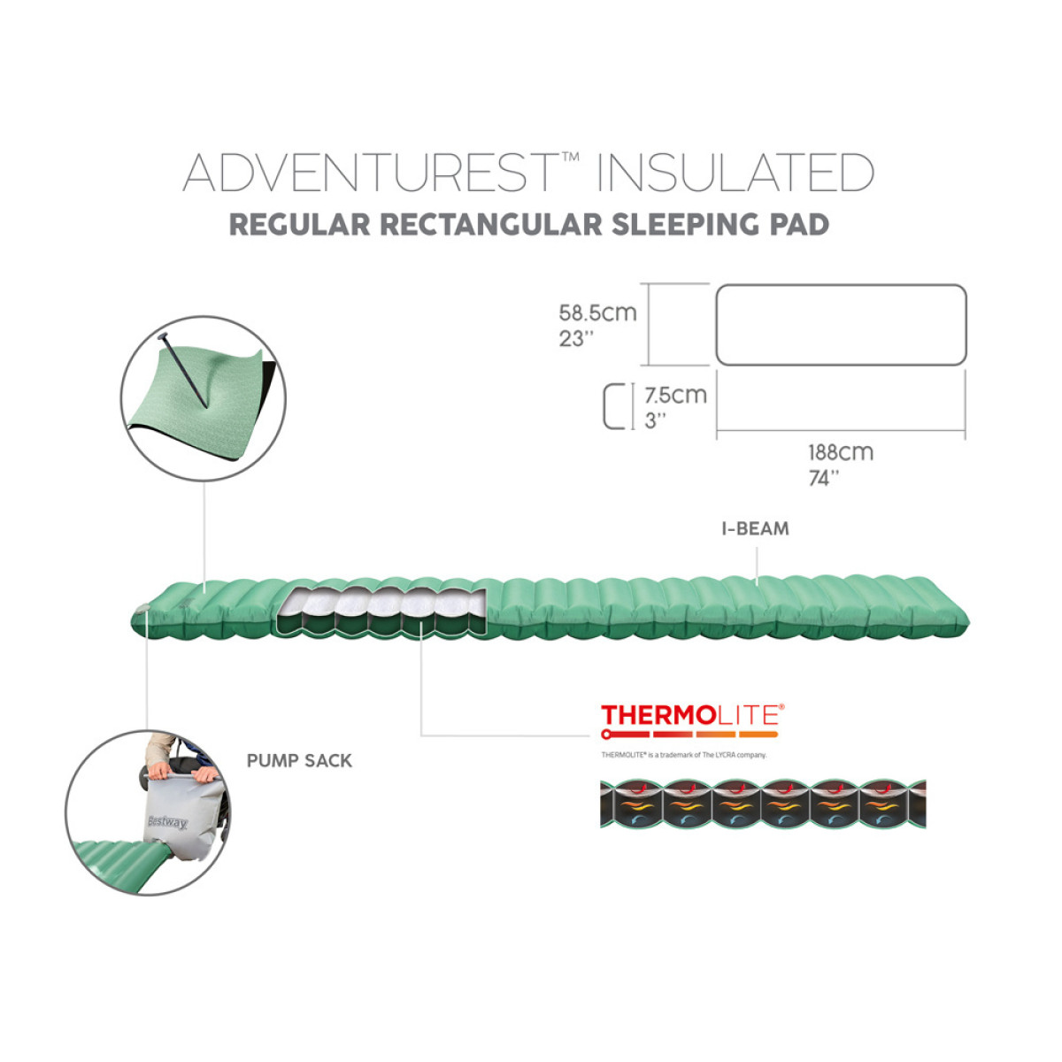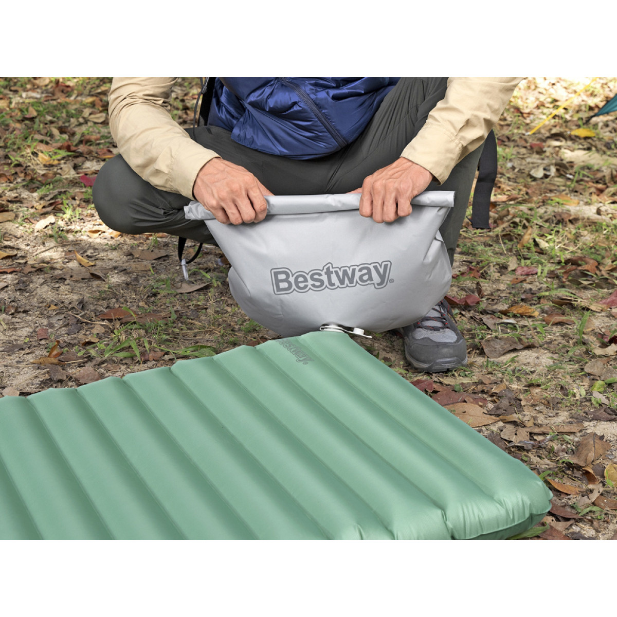 Bestway AdventuRest piepūšamais matracis ir ideāls risinājums tiem, kas novērtē komfortablu atpūtu pludmalē, kempingā vai vienkārši guļot svaigā gaisā zem telts. Matracis ir viegli un ātri piepūšams pateicoties inovatīvajai AirCinch ™ sistēmai. Piepūšana notiek ar maisa palīdzību, pietiek nospiest ar rokām, lai piepildītu matraci ar gaisu. Nav jāuztraucas, ja aizmirsta sūknis, jo šis komplekts ir pilnīgs. Kad matracis ir atbilstoši piepūsts, aizveriet vārstu un izbaudiet atpūtu.