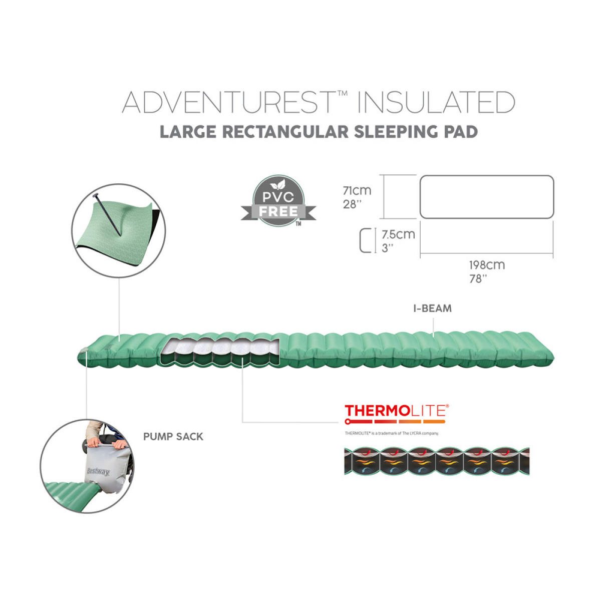 Piepūšamais matracis Bestway AdventuRest ir ideāls risinājums ikvienam, kas novērtē komfortu atpūšoties pludmalē, kempingā vai guļot svaigā gaisā zem telts. Taisnstūra paklājs lieliski derēs arī lielākos guļammaisos. Matracis piedāvā: