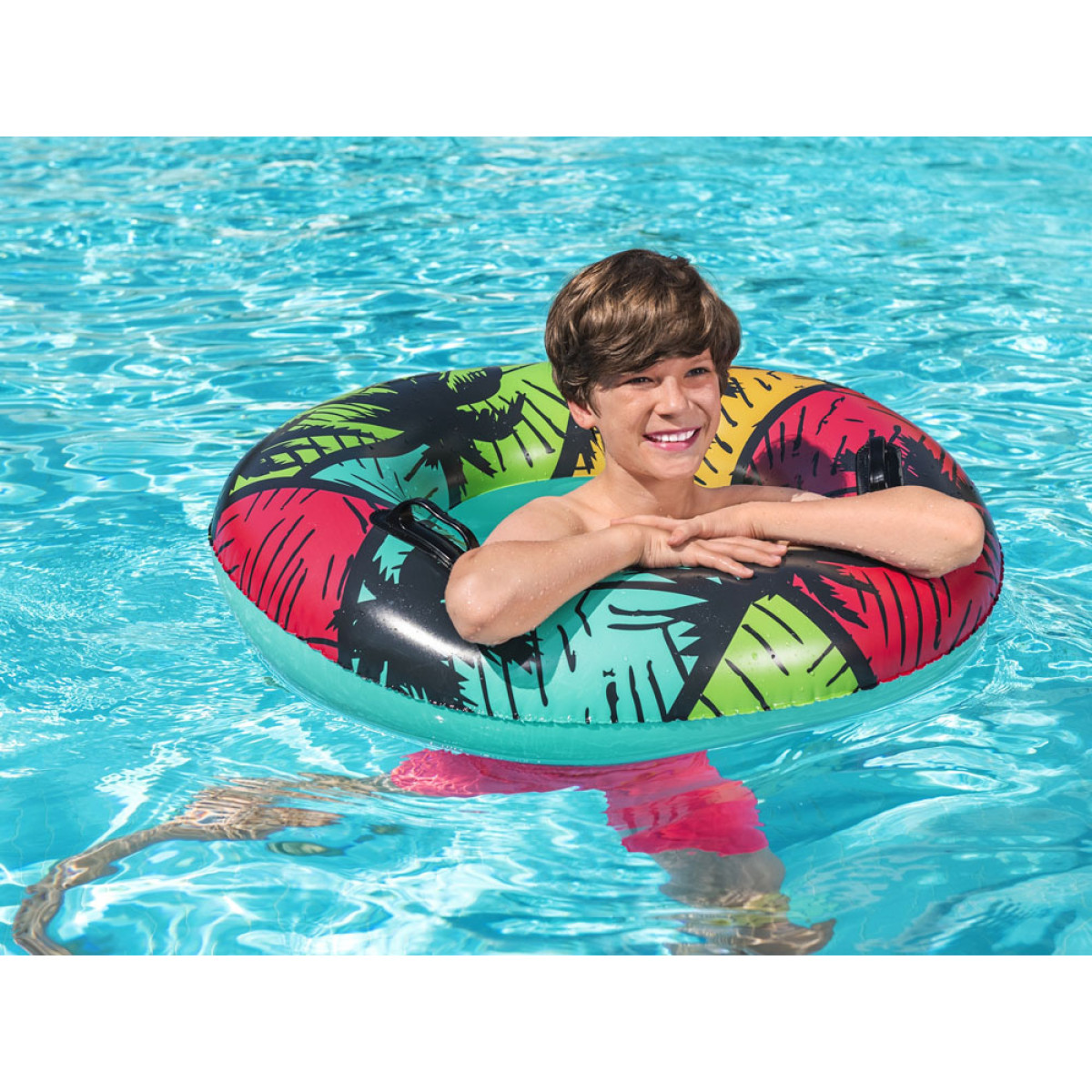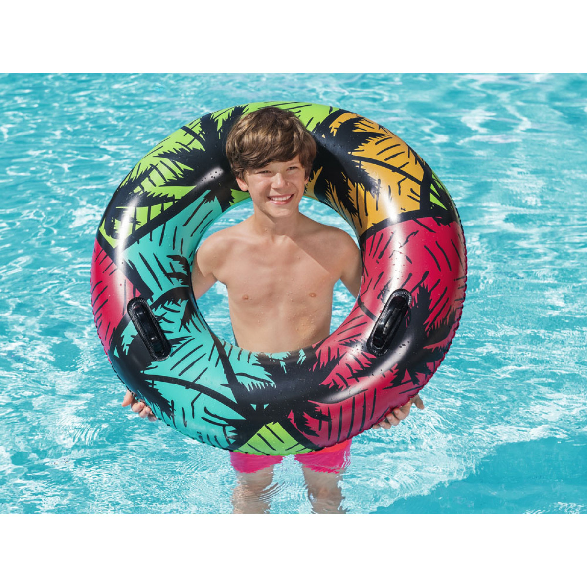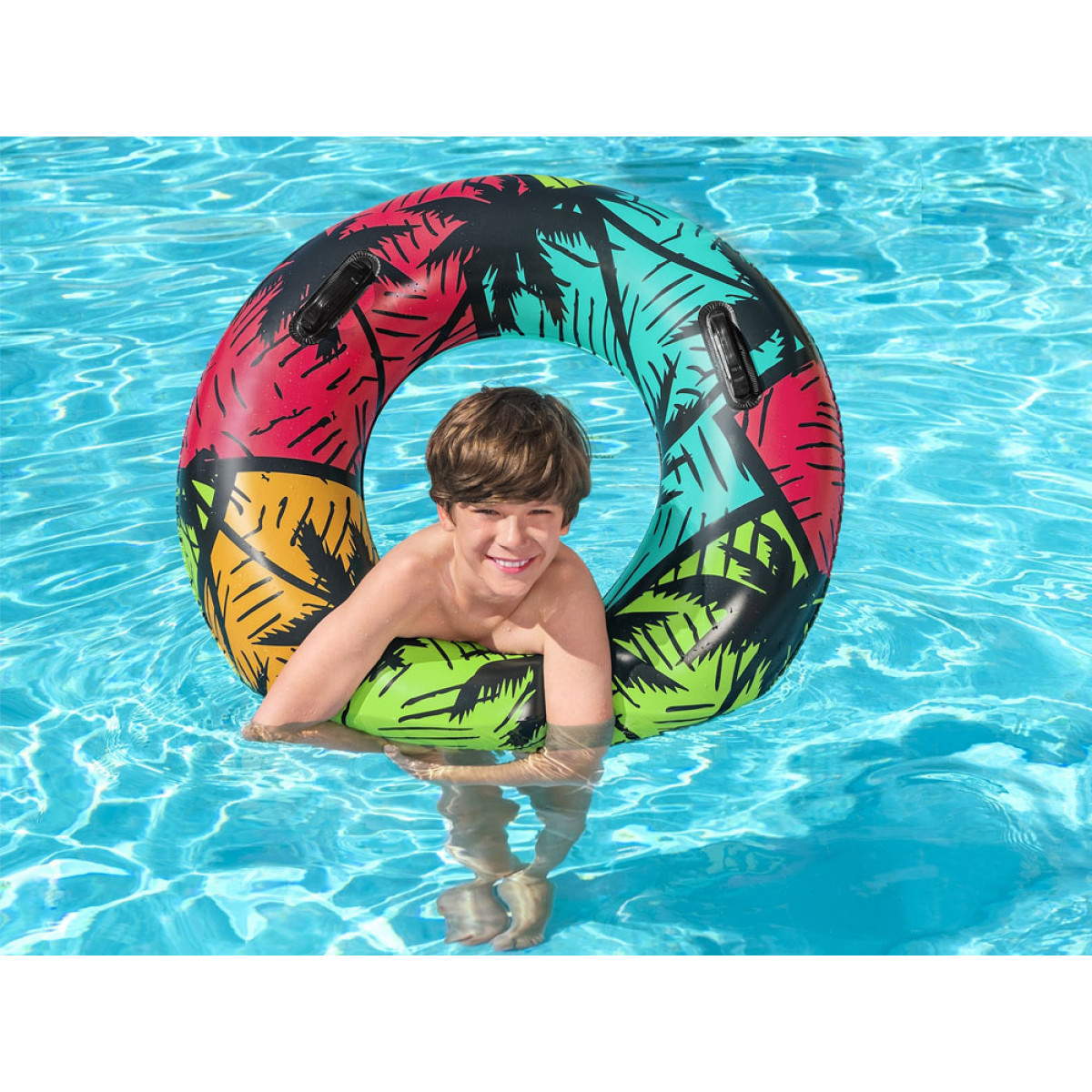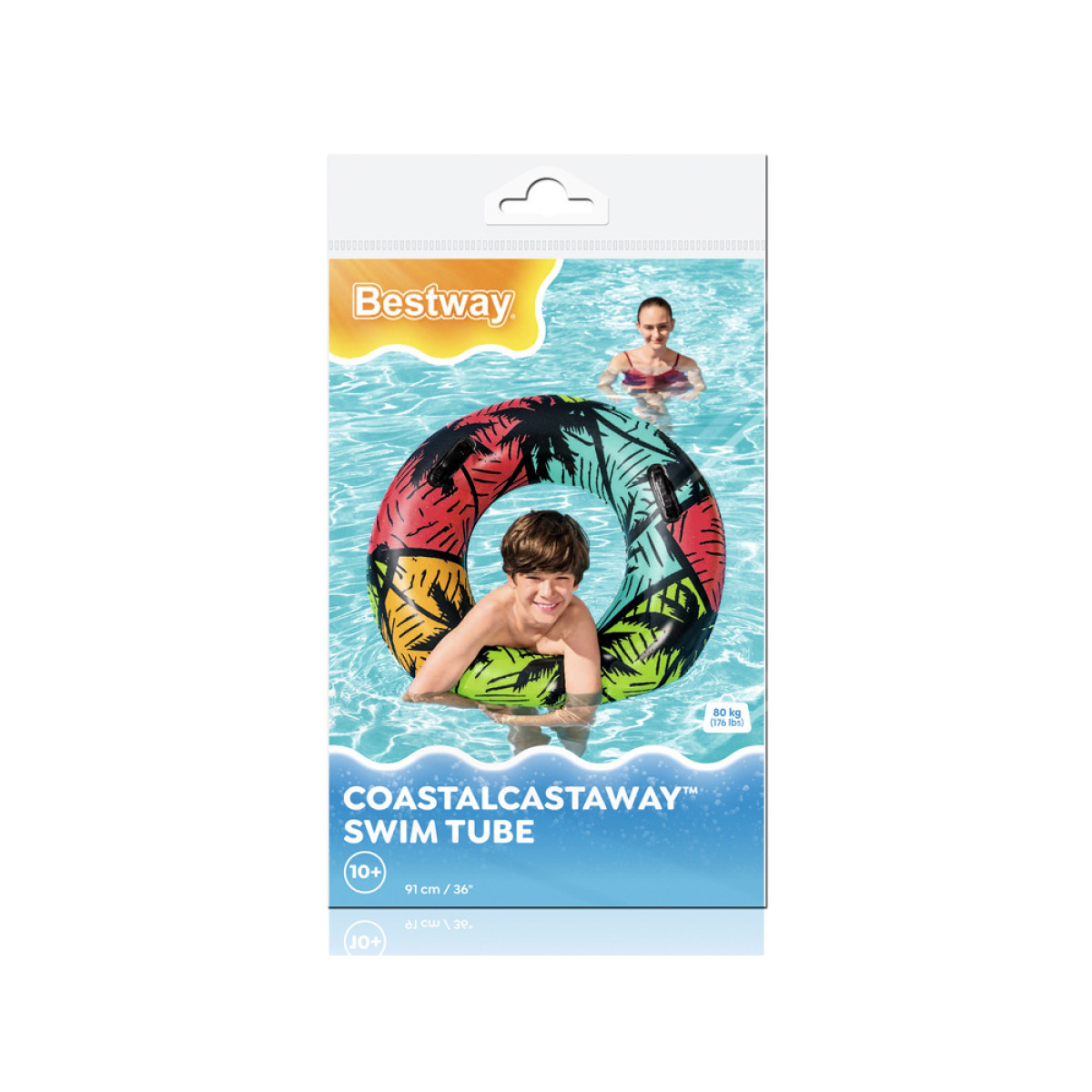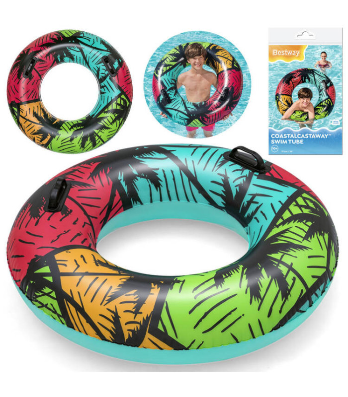 Bestway piepūšamais peldēšanas riņķis 91 cm ir Bestway piedāvājums vasaras sezonai, lai uzturētos uz ūdens virsmas šajā vasaras sezonā. Riņķis ir paredzēts bērniem no 10 gadu vecuma. Skaists tropiskais dizains un intensīvas krāsas piesaistīs ikviena ūdens izklaides cienītāja uzmanību. Riņķis ir aprīkots ar diviem izturīgiem rokturiem, kas atvieglo iekāpšanu un izkāpšanu tiem, kas jūtas nedroši ūdenī. Riņķis ir izgatavots no izturīga PVC materiāla, kas ir izturīgs pret bojājumiem un saules staru iedarbību.