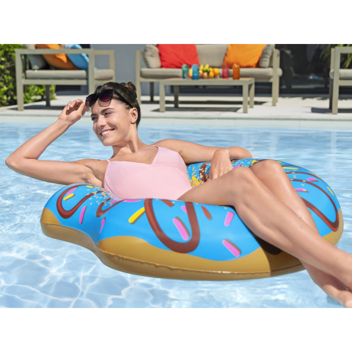 Piepūšams, liels ūdens riņķis krāsainā donuta formā ir lieliska izvēle brīvdienām un baseina apmeklējumiem. Oriģinālais izskats un modernā krāsu gamma piesaista uzmanību un padara atpūtu pie ūdens patīkamāku.