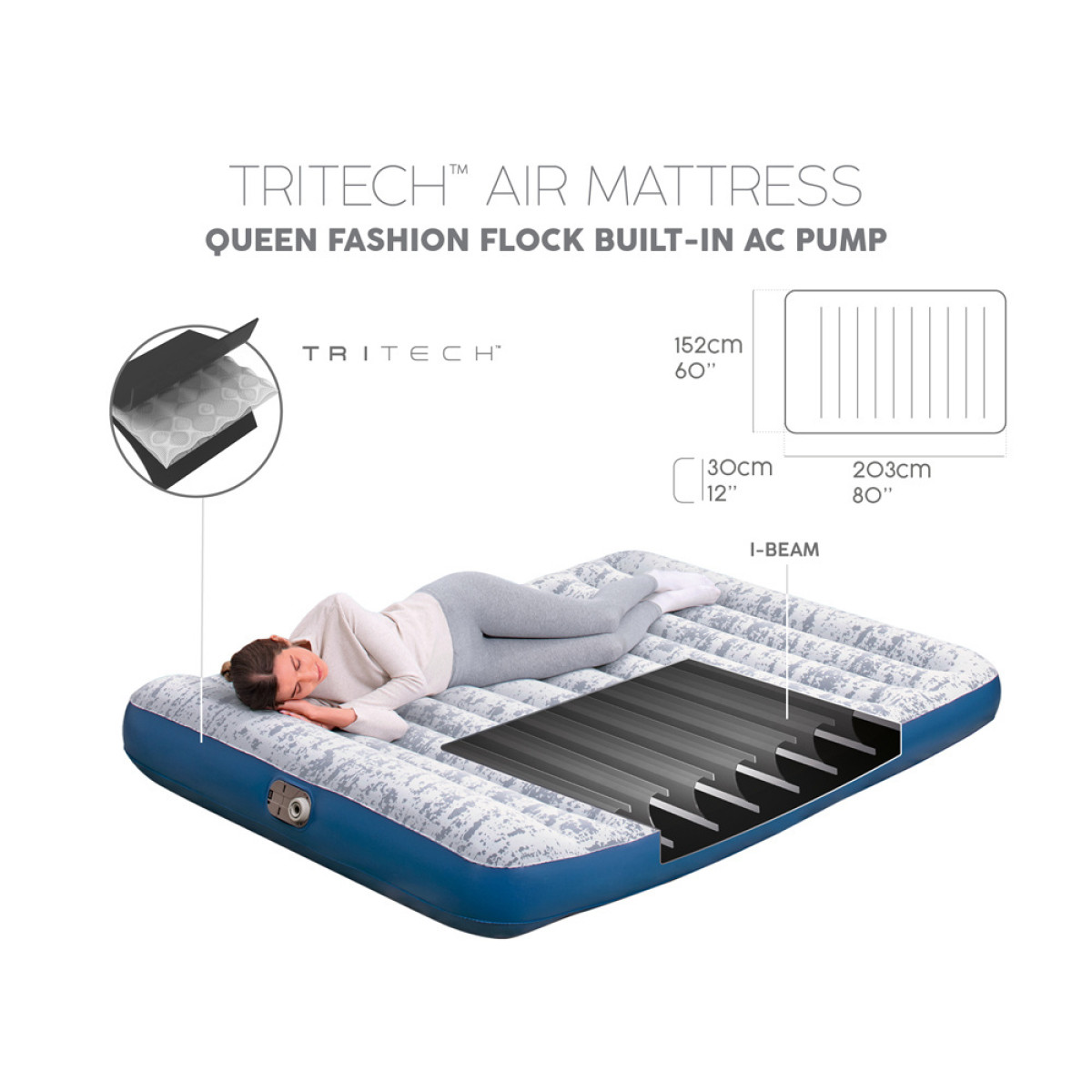Matrača iekšējā konstrukcija ir izgatavota no Tritech™ materiāla, kas nodrošina izturību un stabilitāti, vienlaikus saglabājot matrača formu, neatkarīgi no tā, cik reizes tas tiek piepūsts un iztukšots. Augšējā matrača daļa ir pārklāta ar mīkstu flokētu materiālu.