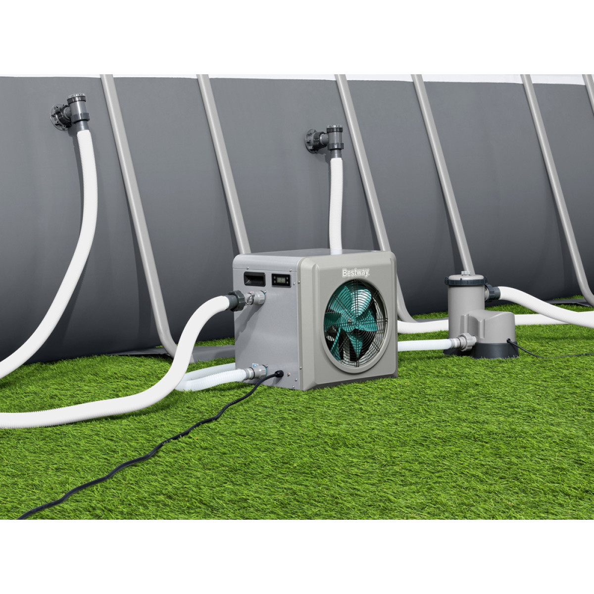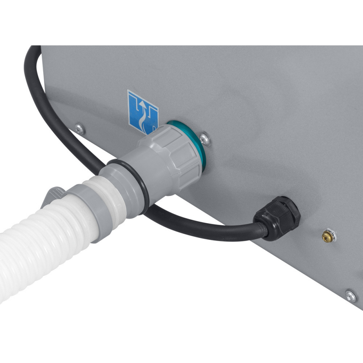 Elektriskais sildītājs ir aprīkots ar divām šļūteņu izejām, viena savienota ar filtrēšanas sūkni, otra - ar virszemes baseinu.