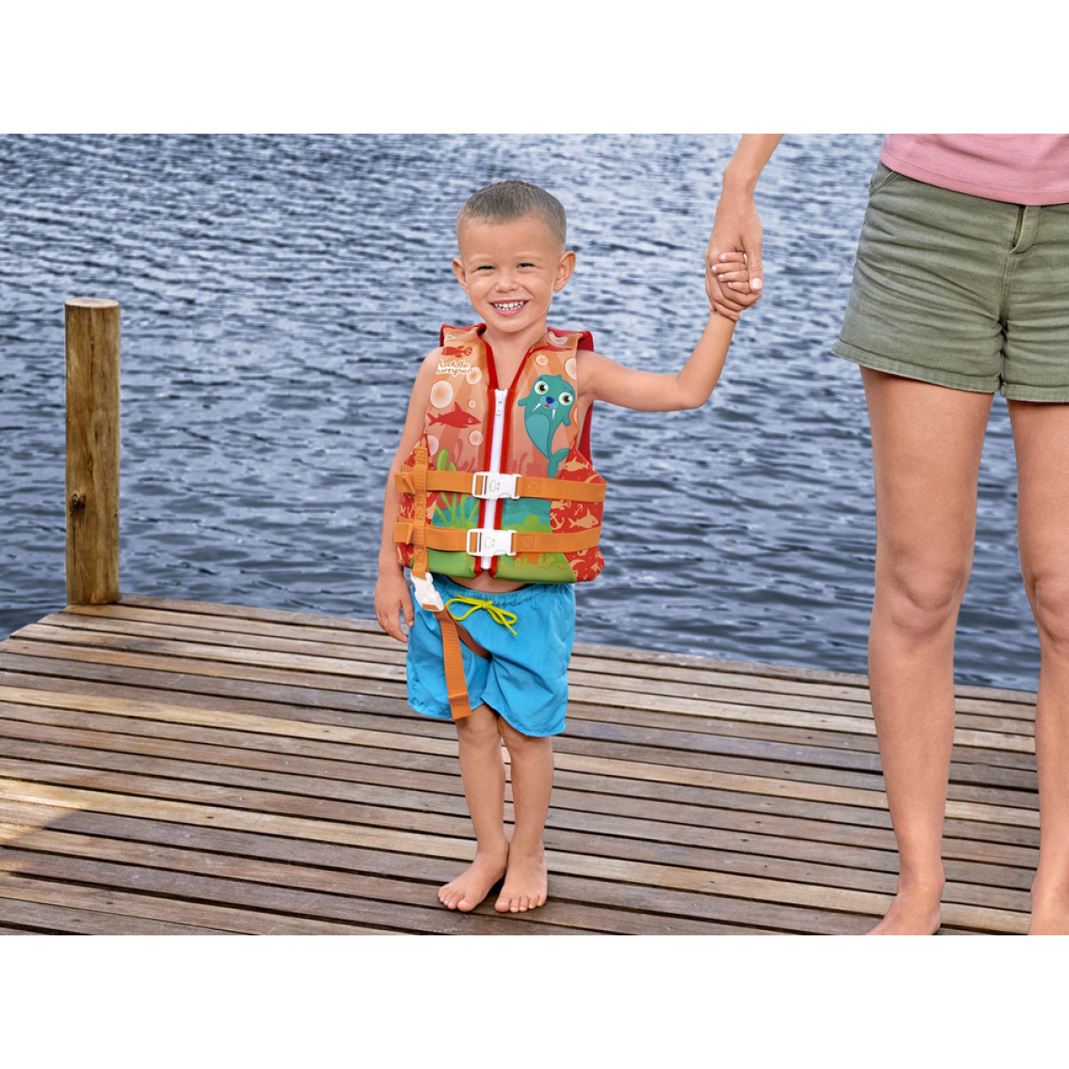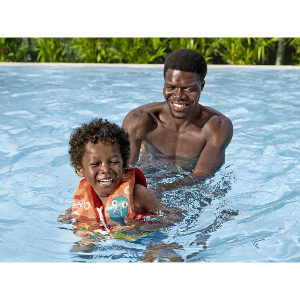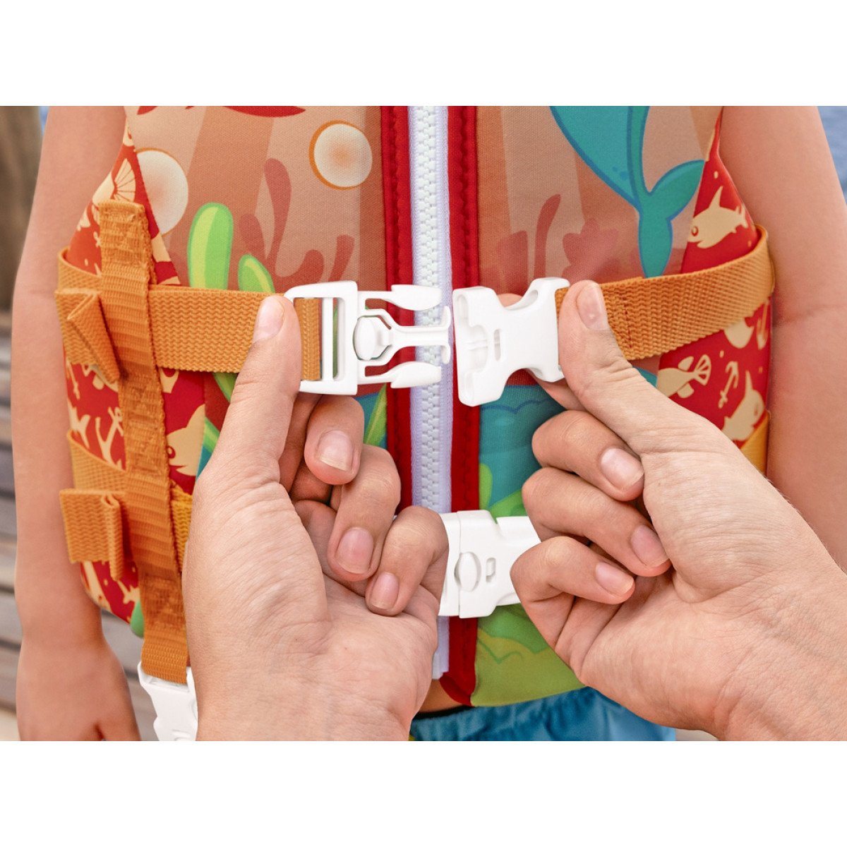 Droša piegulšanās: Elastīga un pielāgojama veste ar trīs sprādzēm, rāvējslēdzēju un kāju siksnu, kas nodrošina drošu piegulšanos un kustību brīvību jūsu bērnam. Tagad jūsu bērns var šļakstīties un spēlēties visu dienu, un jūs varat būt mierīgs, zinot, ka tas ir drošs.