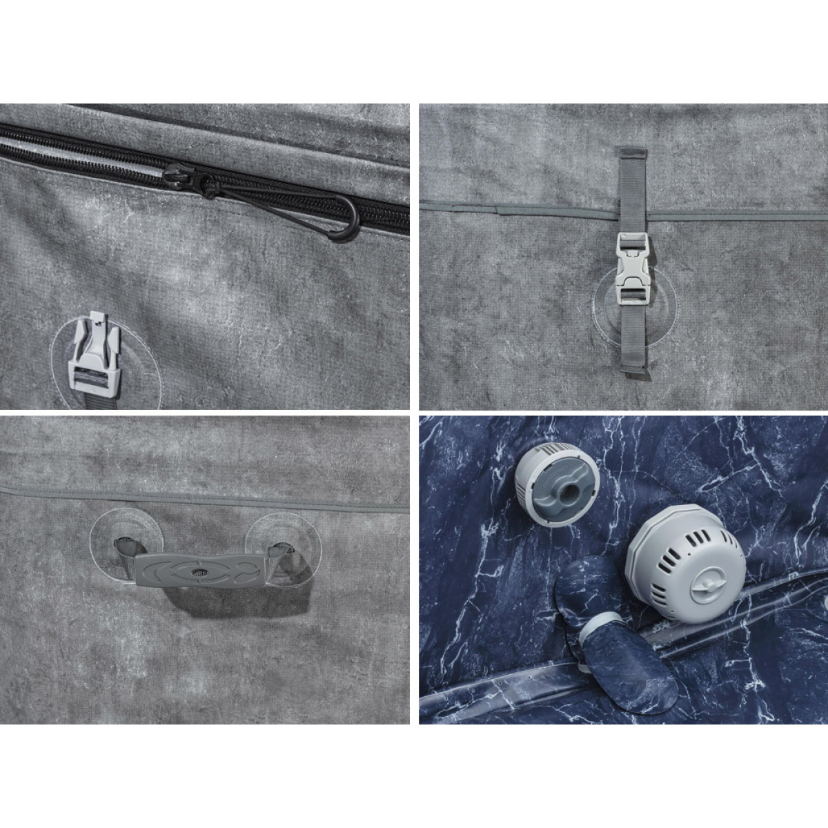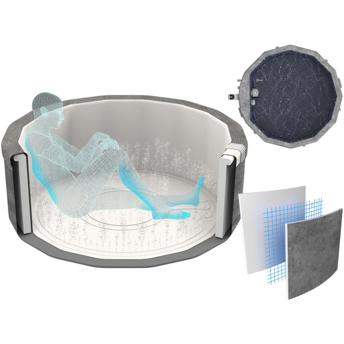 - Vannas konstrukcija: balstīta uz ThermaCore™ tehnoloģiju ar putu izolāciju, kas efektīvi saglabā siltumu džakuzi iekšpusē un palielina energoefektivitāti pat par 60% salīdzinājumā ar tradicionālajām piepūšamajām vannām.