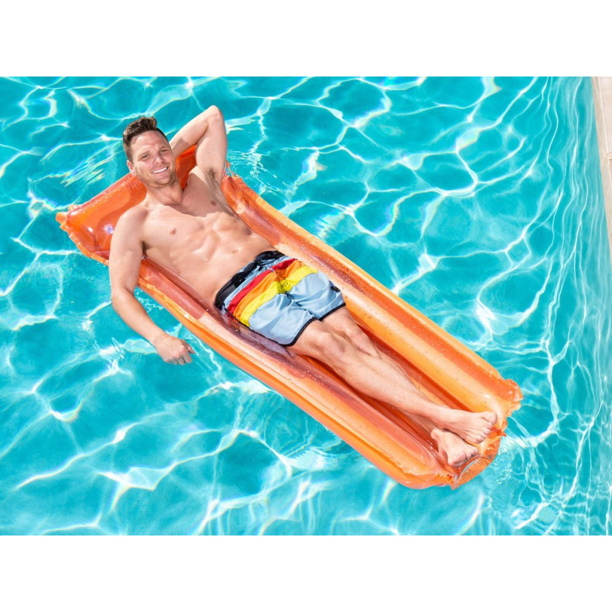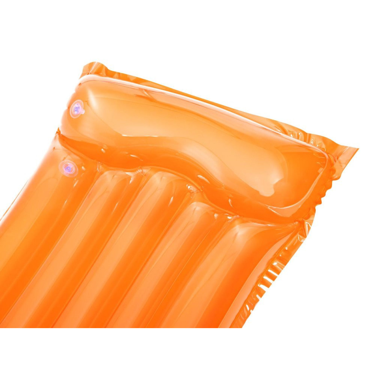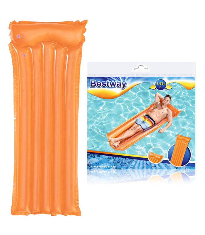 Uzsūknējamais oranžais matracis ir lieliska izvēle tiem, kam patīk atpūsties brīvā dabā. Vienkāršs, krāsains uzpūšamais pludmales krēsls ir neaizstājams pludmales vai baseina apmeklējuma laikā. Piedāvātais modelis spēj noturēt līdz 90 kg svaru, tāpēc tas ir ideāli piemērots gan bērniem, gan pieaugušajiem. Peldēšanas matracis ar uzpūšamu galvas balstu, izmēros 183 cm x 76 cm, ir izgatavots no mīksta, bet izturīga PVC materiāla. Produkts vasaras svaigajās krāsās ļoti efektīvi izskatīsies uz jebkuras pludmales.