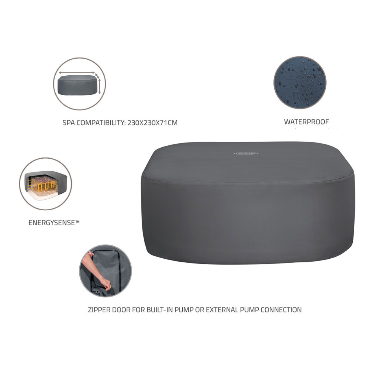 - saderīgs ar kvadrātveida SPA, izmēri: 230 x 230 x 71 cm