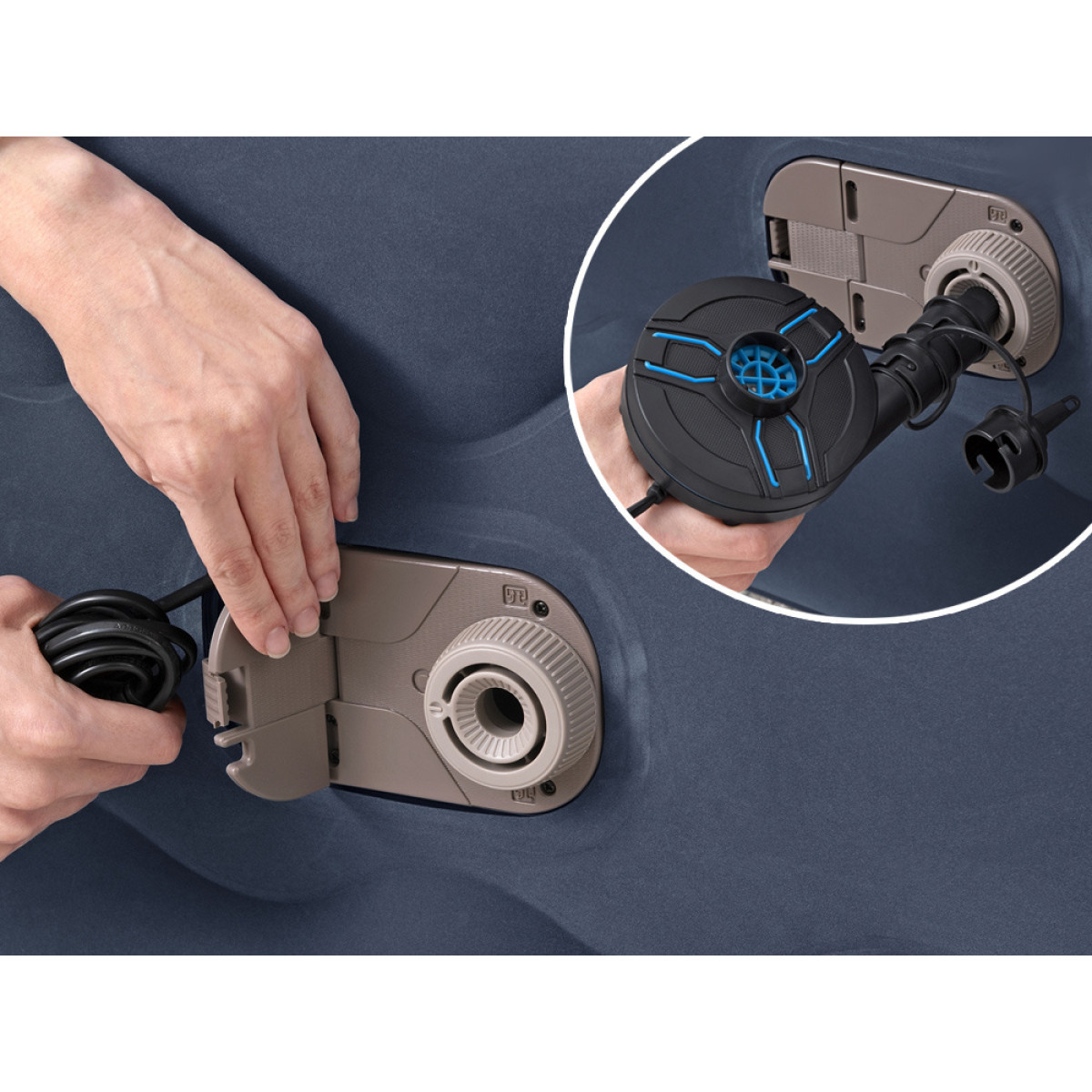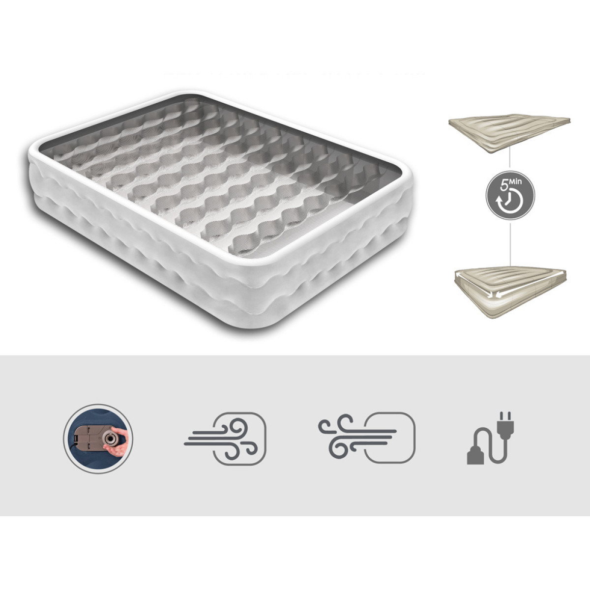 Bestway Tritech Air Mattress King ir aprīkots ar iebūvētu elektrisko pumpi 220-240V, kas ļauj ātri un viegli piepūst un iztukšot gaisu. Šis process aizņem tikai dažas minūtes, kas ievērojami atvieglo gulēšanas vietas sagatavošanu. Ja nav pieejama elektrība, matraci var piepūst arī ar standarta rokas vai kāju pumpi.