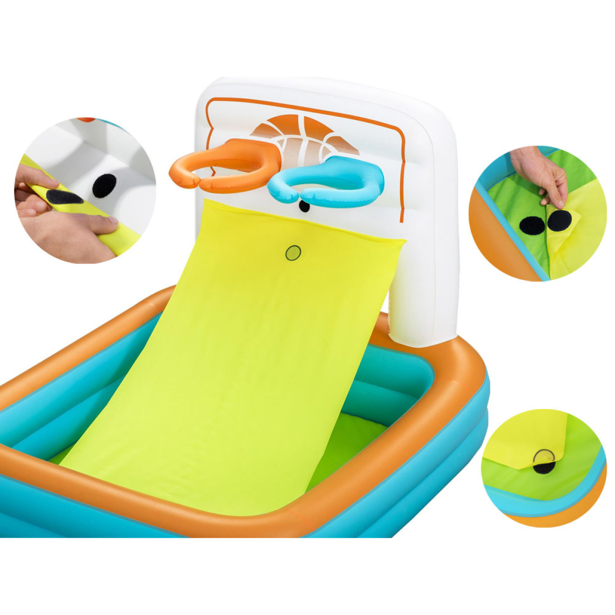 Komplekts piedāvā daudzas spēļu iespējas. Divkāršie basketbola grozi ļauj organizēt aizraujošas šaušanas sacensības, bet futbola mūrīša vārti ļauj gūt punktus futbola spēlē. Papildus attīstāmā "aizkaru" funkcija, kad izvērsta, kalpo kā atgriešanās rampa basketbola spēlei, bet sarullēta pārvēršas par klasisku baseinu ar bumbām.