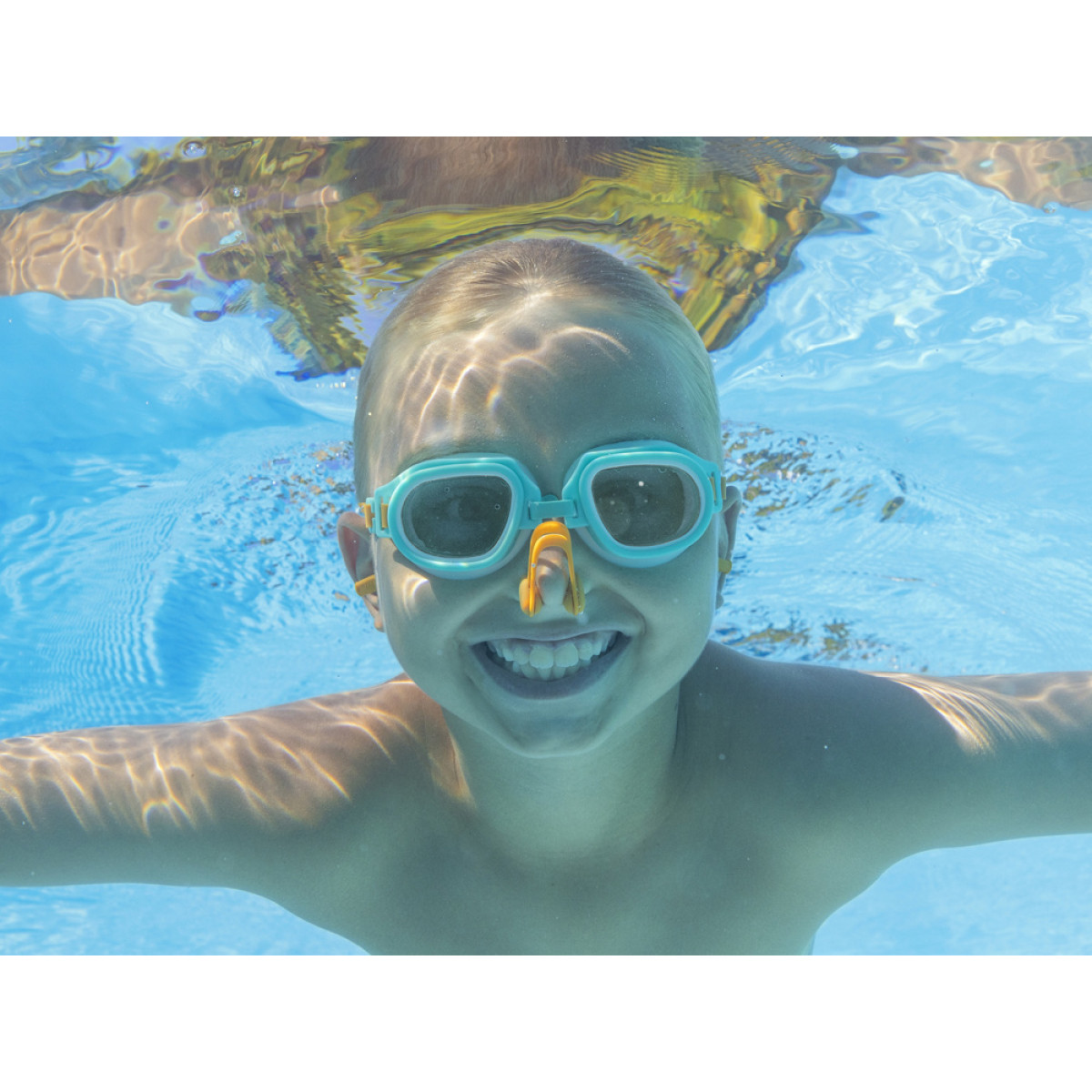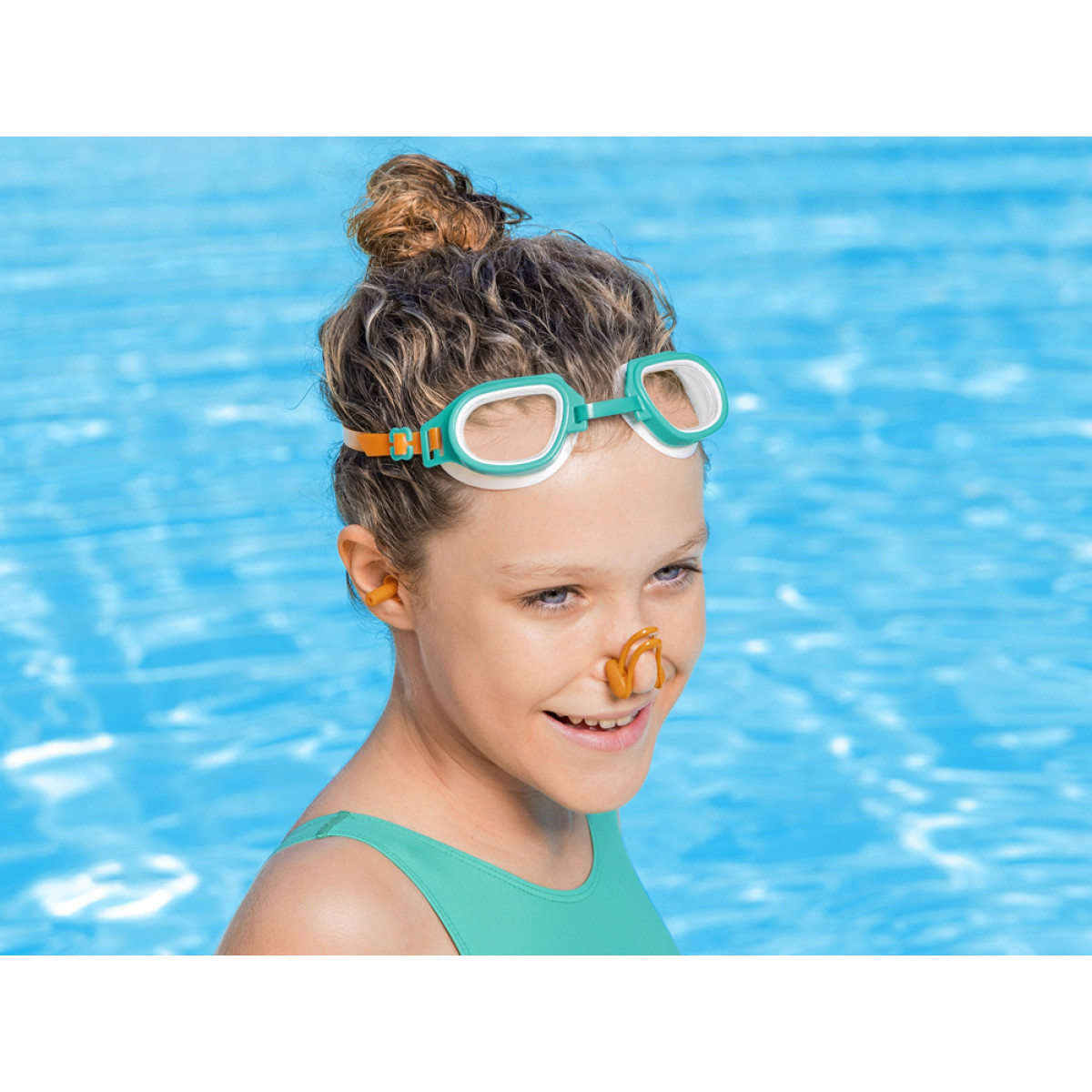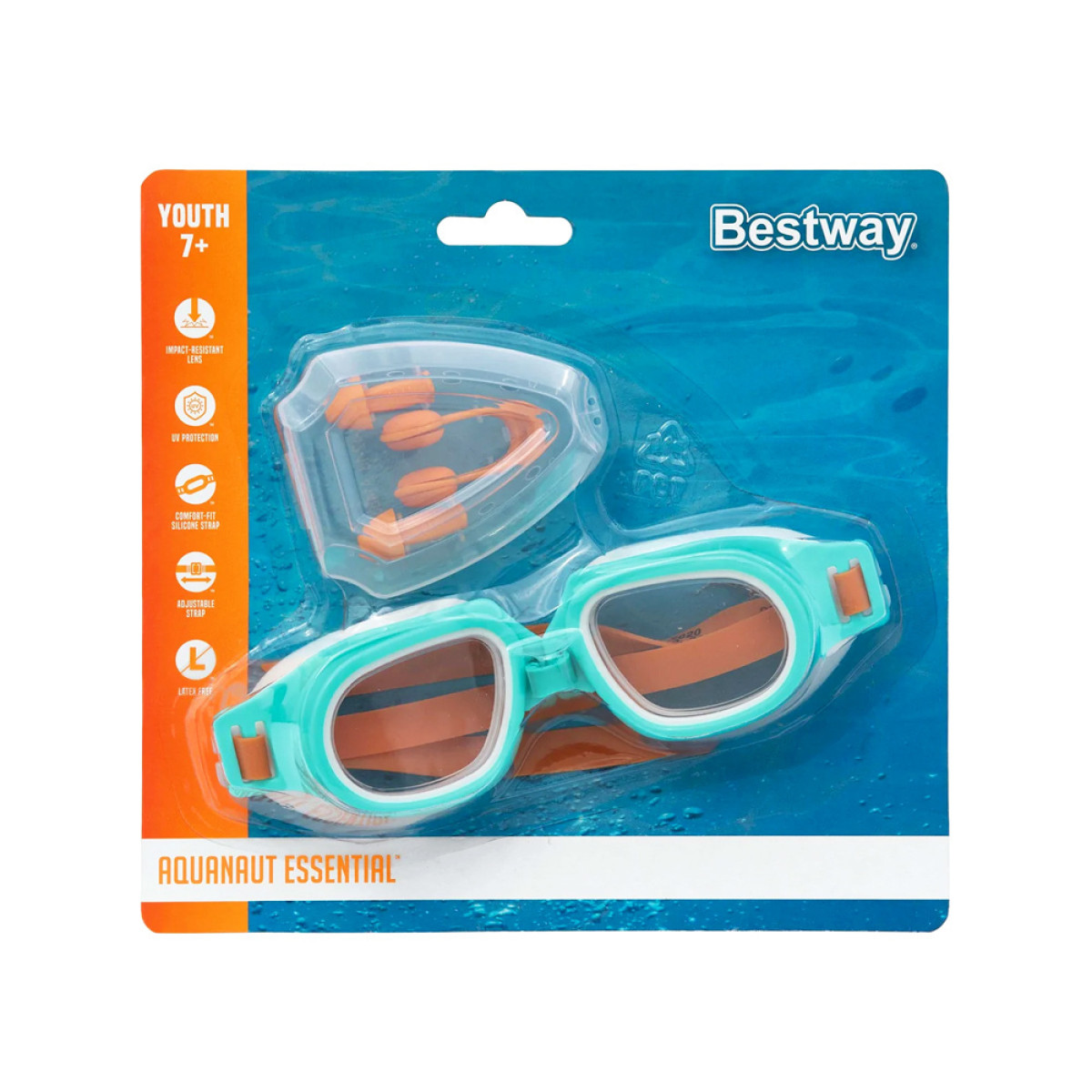 Bestway® Aquanaut Essential Brilles Komplekts noteikti noderēs pirmajās peldēšanas nodarbībās. Tas ir izgatavots, domājot par komfortu un drošību jaunajiem peldētājiem baseinā. Ideāls peldēšanas komplekts jebkuram zemūdens piedzīvojumu cienītājam ietver briļļu pāri, deguna klipsi, ausu aizbāžņus un uzglabāšanas etviju. Šis komplekts satur visu, kas nepieciešams ūdens baudīšanai, atklājot zemūdens noslēpumus! Tas ir paredzēts bērniem no 7 gadu vecuma, un pateicoties regulējamiem siksnām, tas viegli pielāgojas lietotāja galvai. Brilles ir izgatavotas no polikarbonāta, ar UV staru aizsargpārklājumu, kas aizsargā bērna acis no saules stariem, kad tās ir iegremdētas ūdenī.